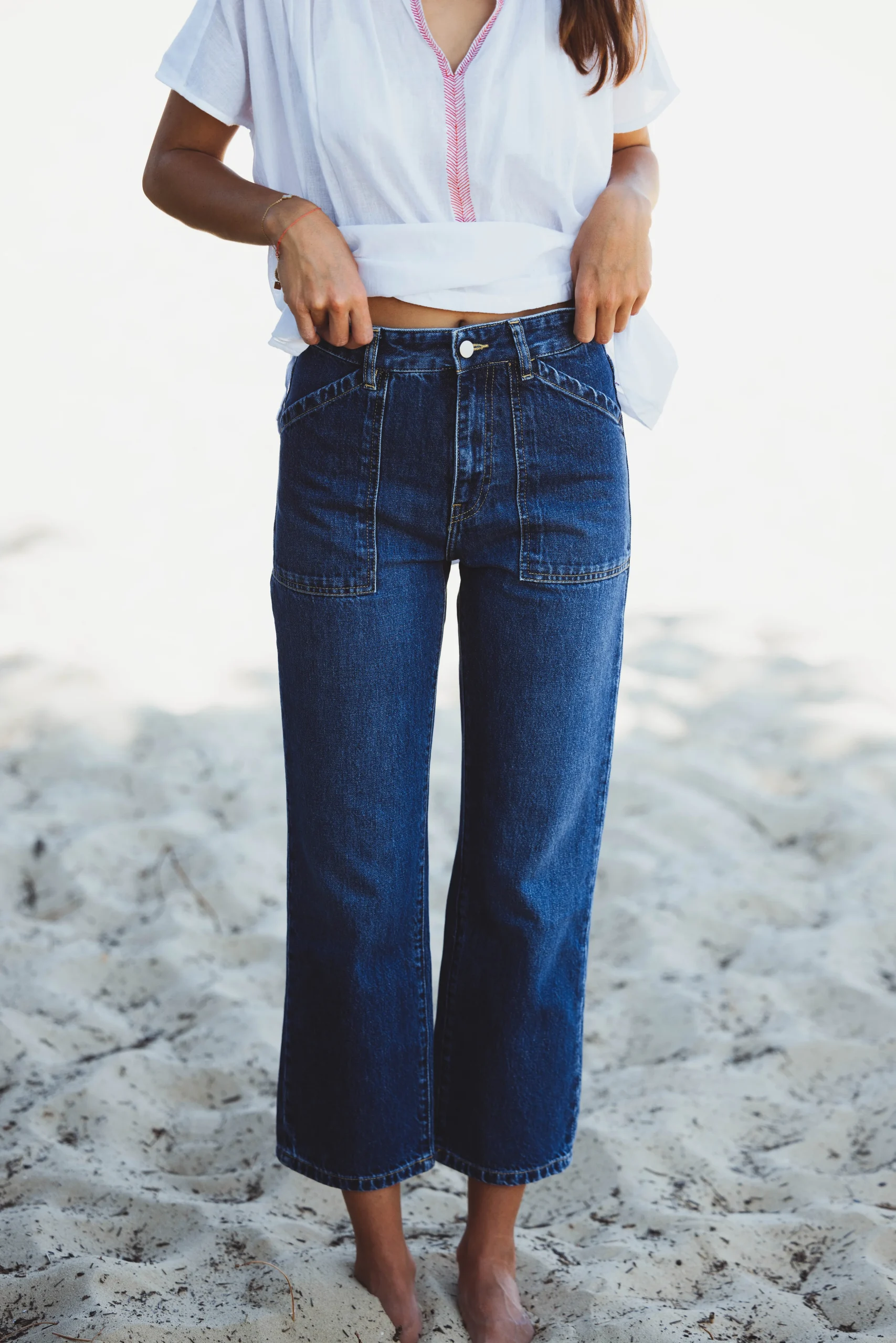 Le parfait jean Eddy en 100% coton dans un bleu soutenu. Deux grandes poches plaquées à l’avant et deux poches classiques à l’arrière. Le jean Eddy a une coupe droite longueur cheville. Solveig mesure 1m77 et porte un 25.
