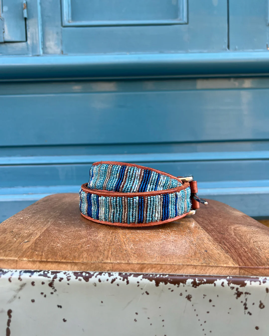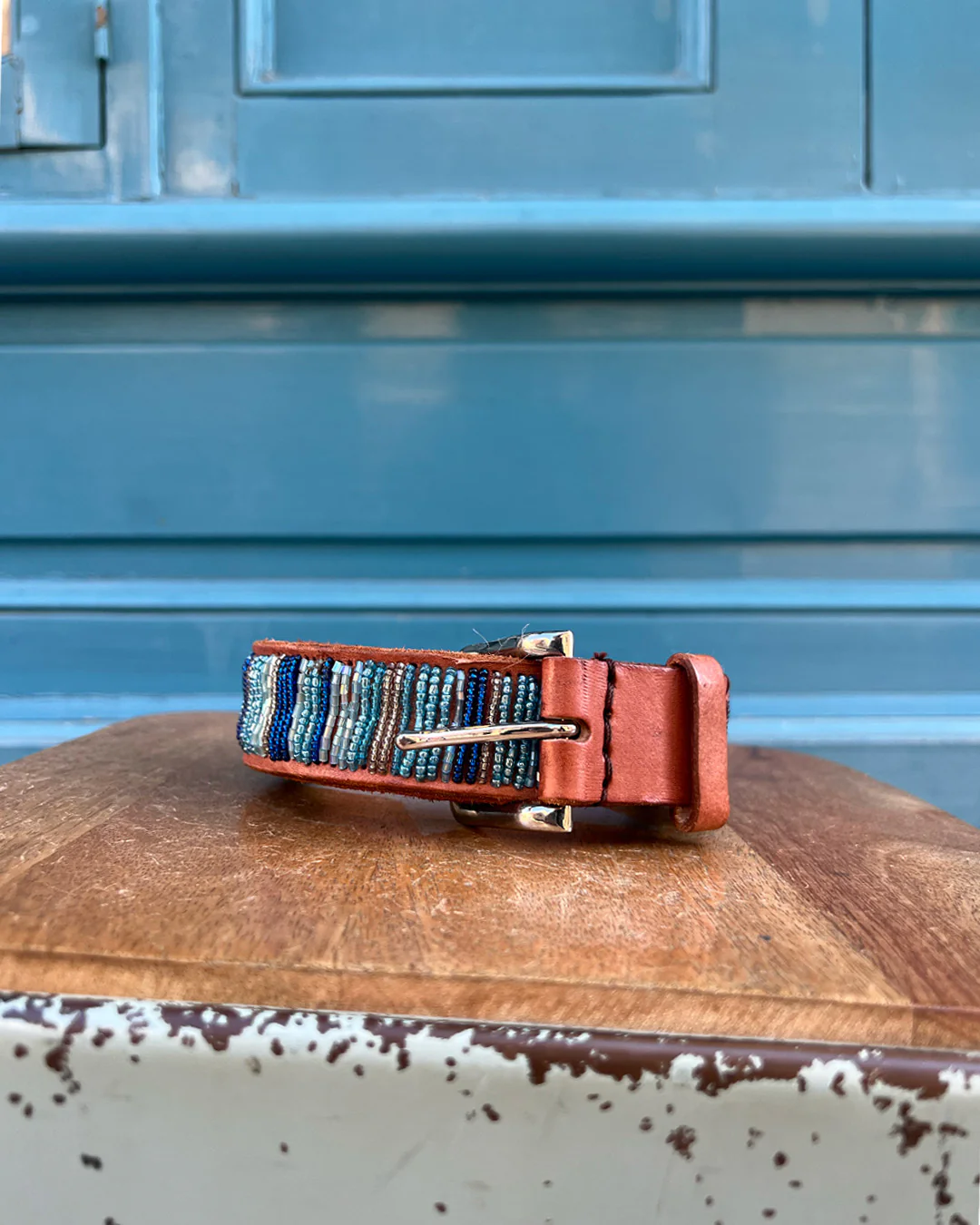 Voici la ceinture Vertical Full en cuir perlée à la main, fabriquée au Kenya, ornée de perles de verre durable colorées dans un motif complexe.