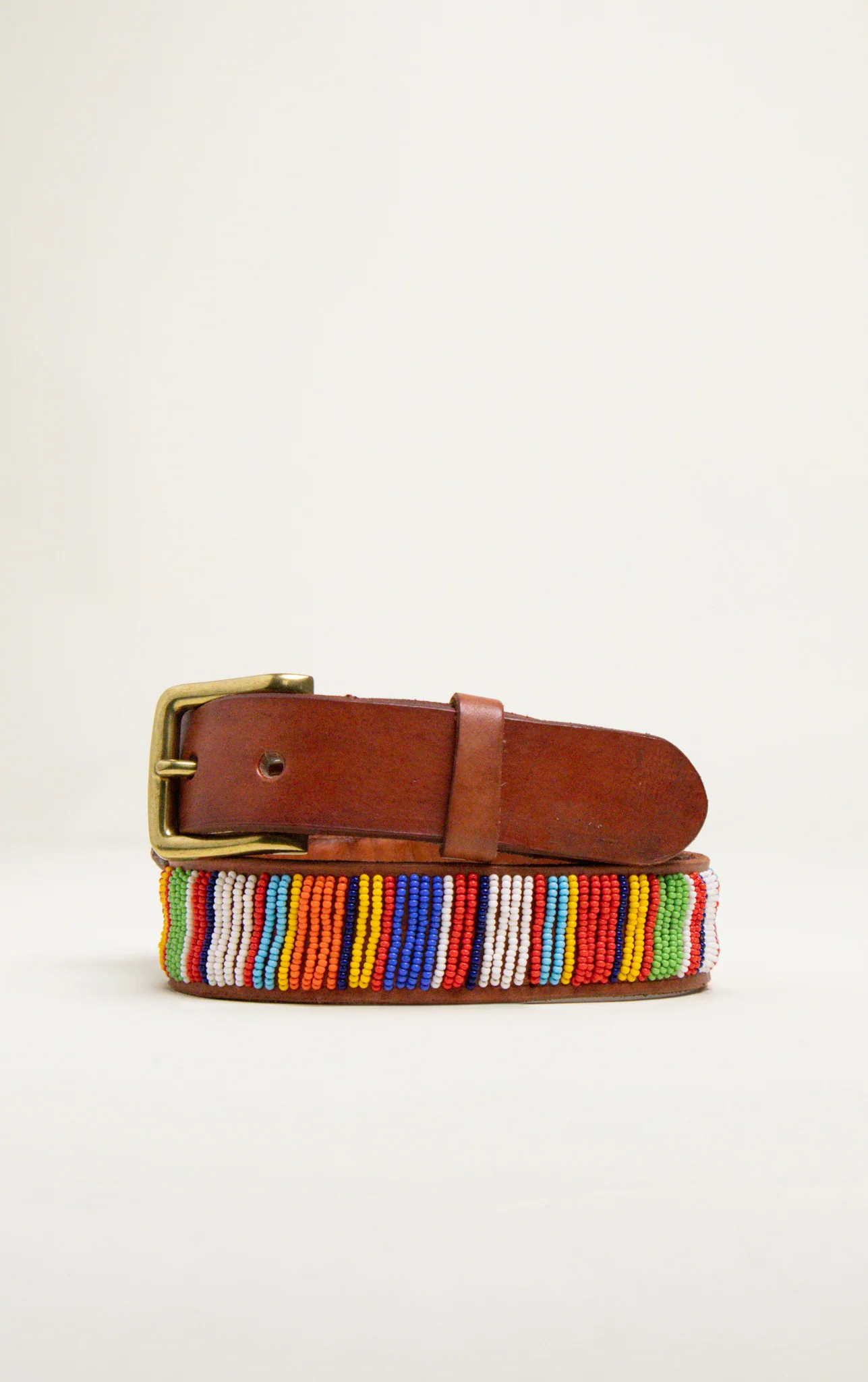 Voici la ceinture Vertical Full en cuir perlée à la main, fabriquée au Kenya, ornée de perles de verre durable colorées dans un motif complexe.