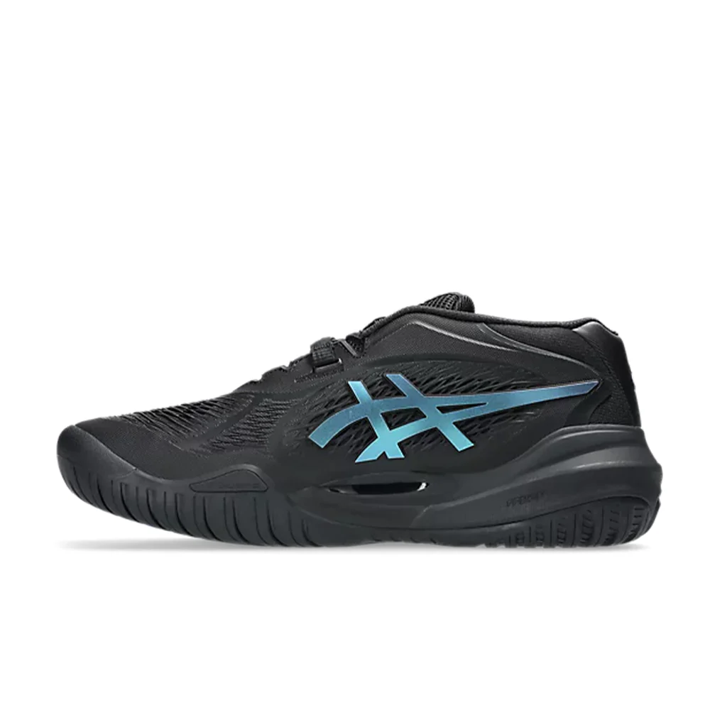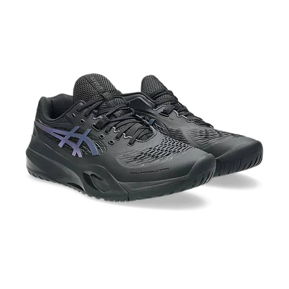 La chaussure de tennis GEL-RESOLUTION™ X NIGHT ENERGY offre un confort optimal aux joueurs qui aiment contrôler le jeu depuis la ligne de fond. Elle arbore une palette de couleurs principalement noire, contrastée par des touches de bleu prisme.