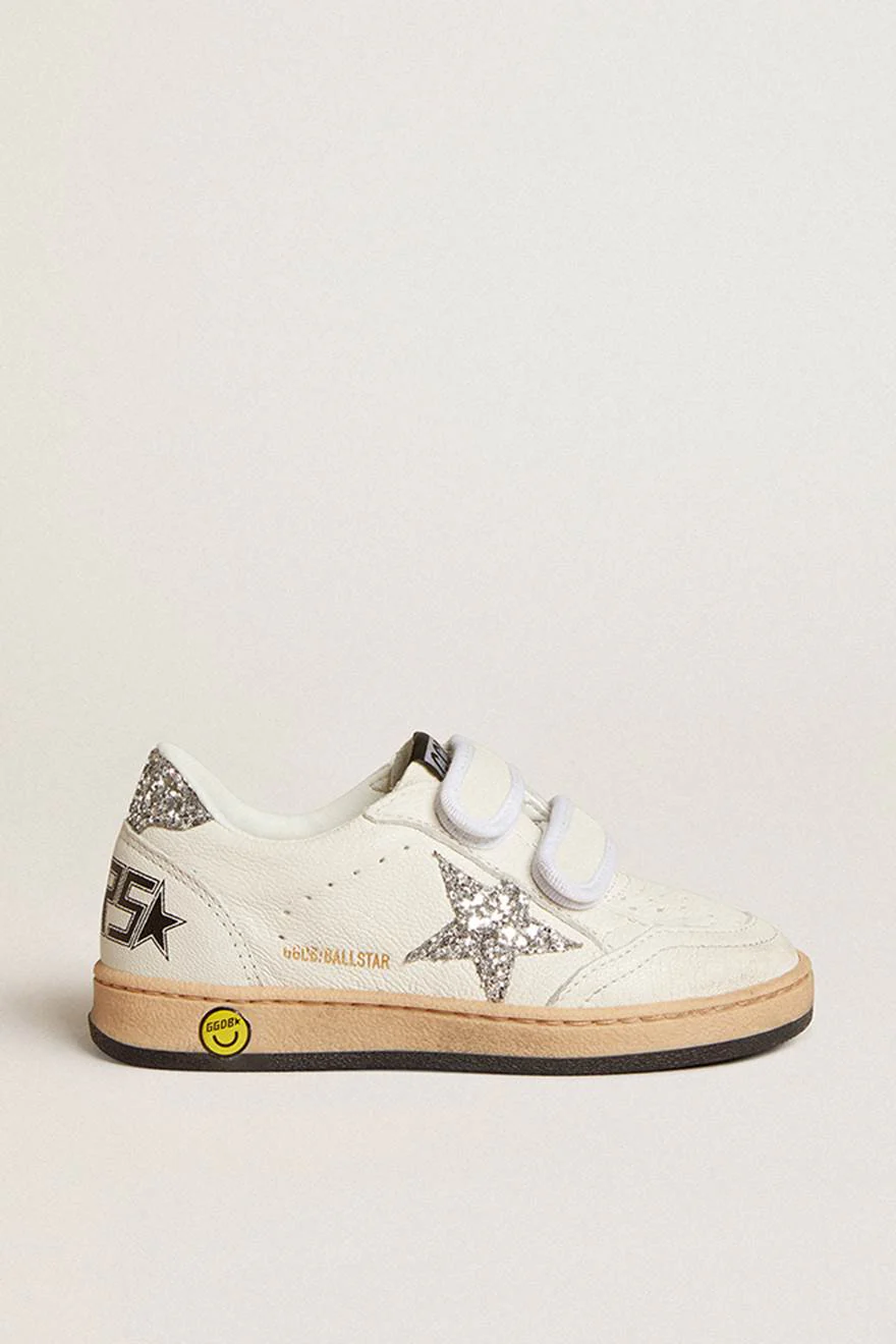 Rêvez des années 1980. Nos sneakers Ball Star font référence à l’esprit des universités américaines, entre un tir au panier et un tour en skateboard. Doté d’une tige en cuir nappa blanc, ce modèle version Young se distingue par une étoile et un contrefort à paillettes argentées. Les scratchs blancs apportent la touche finale : les belles choses ne se démodent jamais.