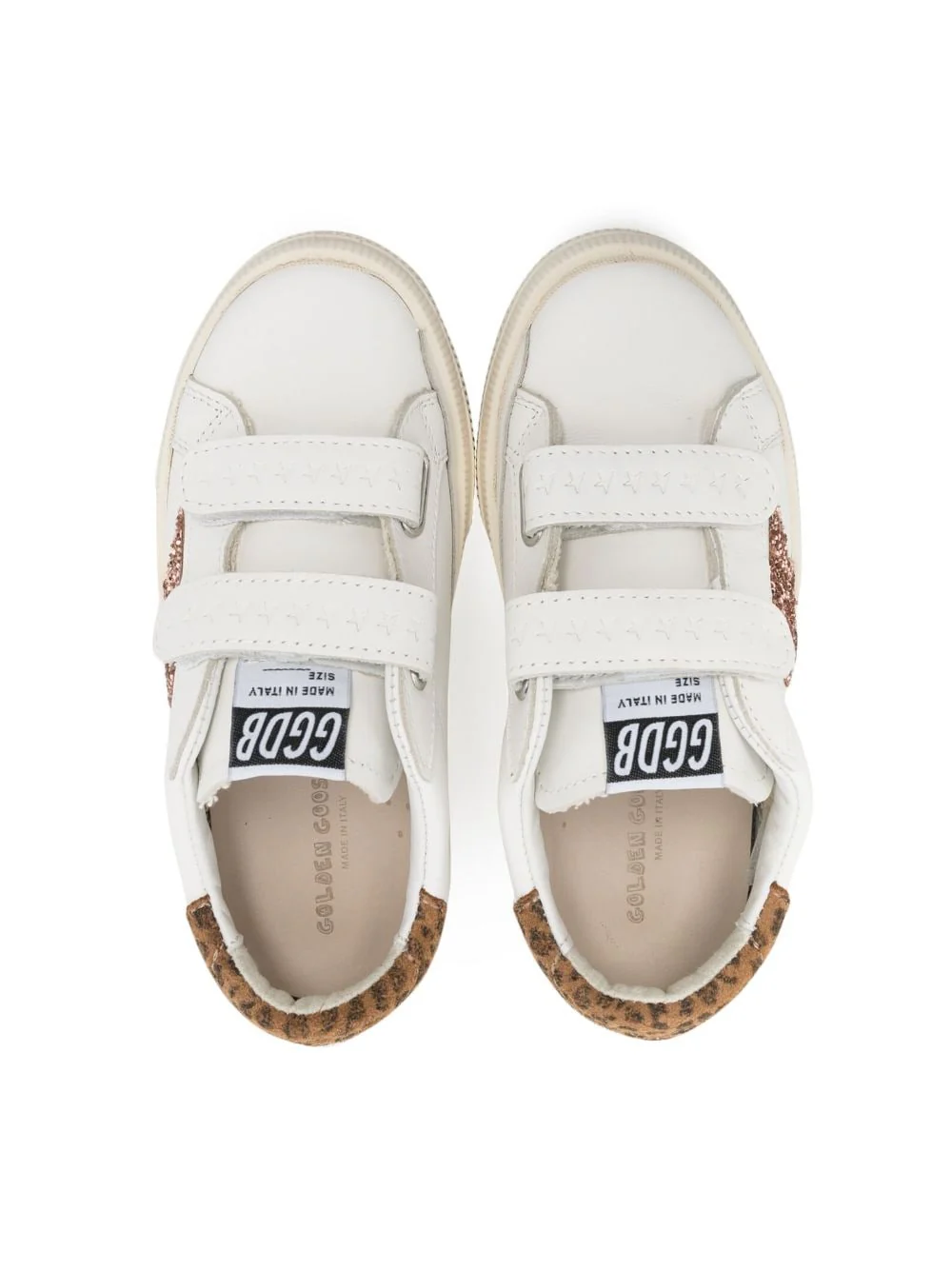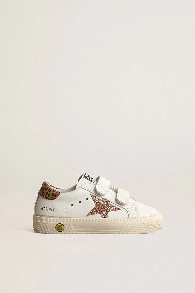 Ces sneakers May School se distinguent par une tige en cuir blanc sur laquelle ressortent l’étoile à paillettes rose et le contrefort en imprimé léopard. Le smiley en contraste sur la bande de renfort et les scratch complètent le style.