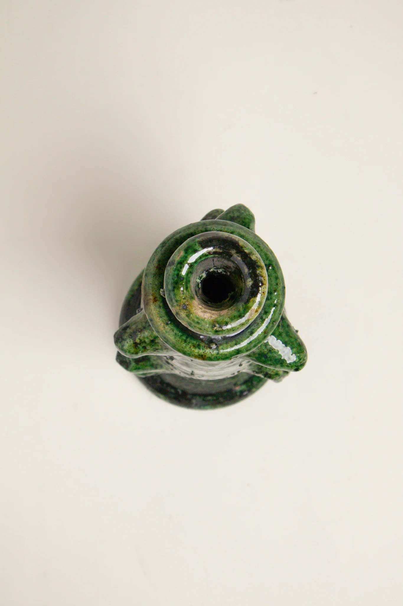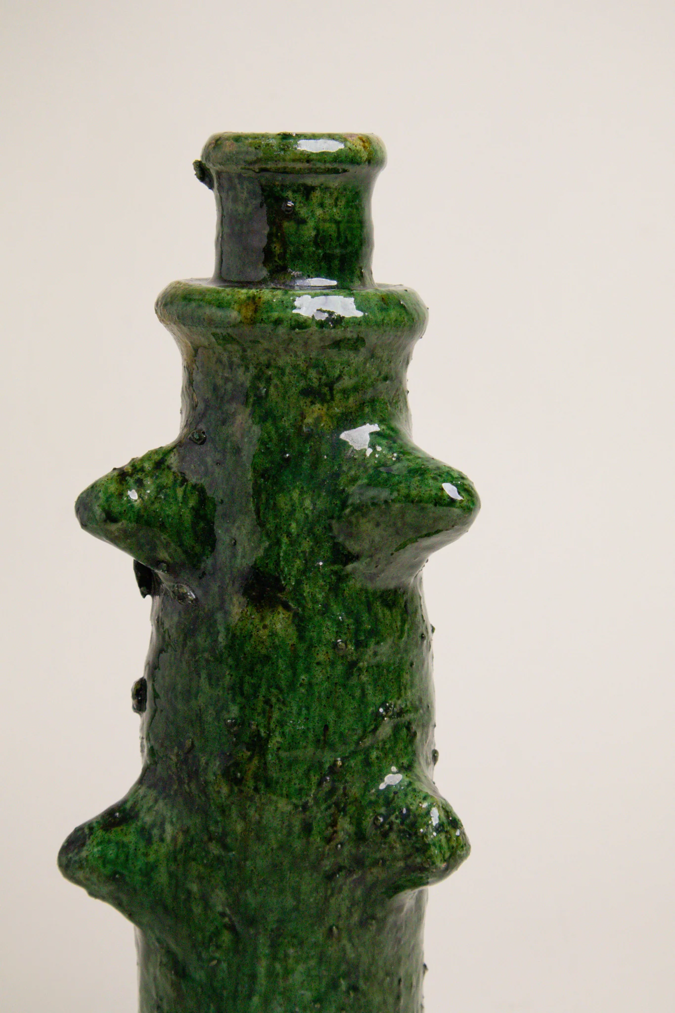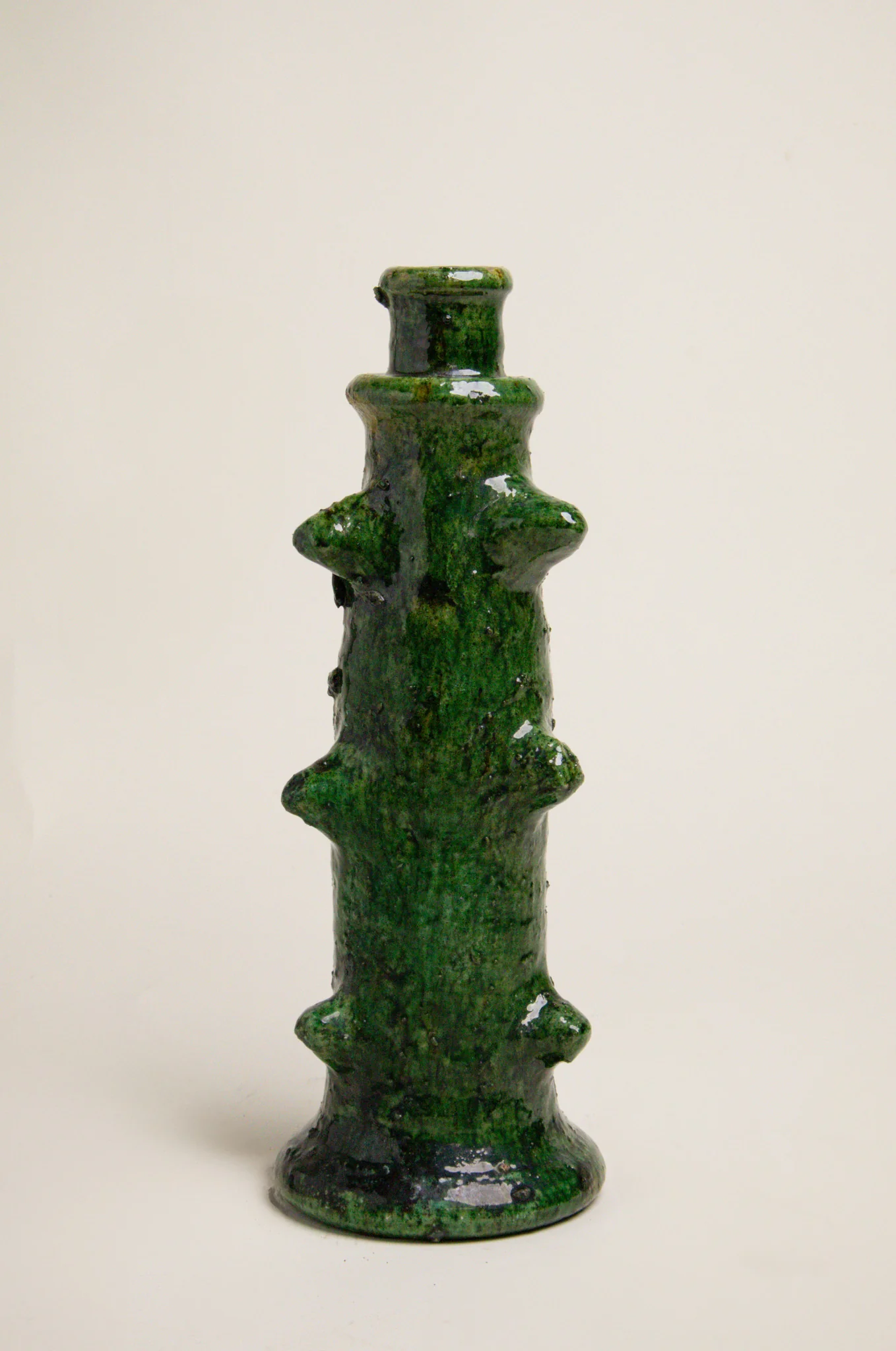 Ce bougeoir marocain en tamegroute, unique en son genre, présente une magnifique teinte verte due à l’oxydation naturelle du cuivre lors de la cuisson, un processus qui confère à chaque pièce une patine distincte et pleine de caractère. Réalisé à la main par des artisans qualifiés, il est orné de pointes délicates, ajoutant à la fois texture et originalité à son design. Le mélange de la terre et du cuivre crée un contraste saisissant, et les pointes sculptées permettent de jouer avec la lumière, créant une atmosphère chaleureuse et envoûtante. Idéal pour sublimer votre décoration, ce bougeoir allie tradition et modernité, tout en apportant une touche artisanale authentique à votre intérieur. Une pièce d’exception qui invite à la contemplation et à la sérénité.
