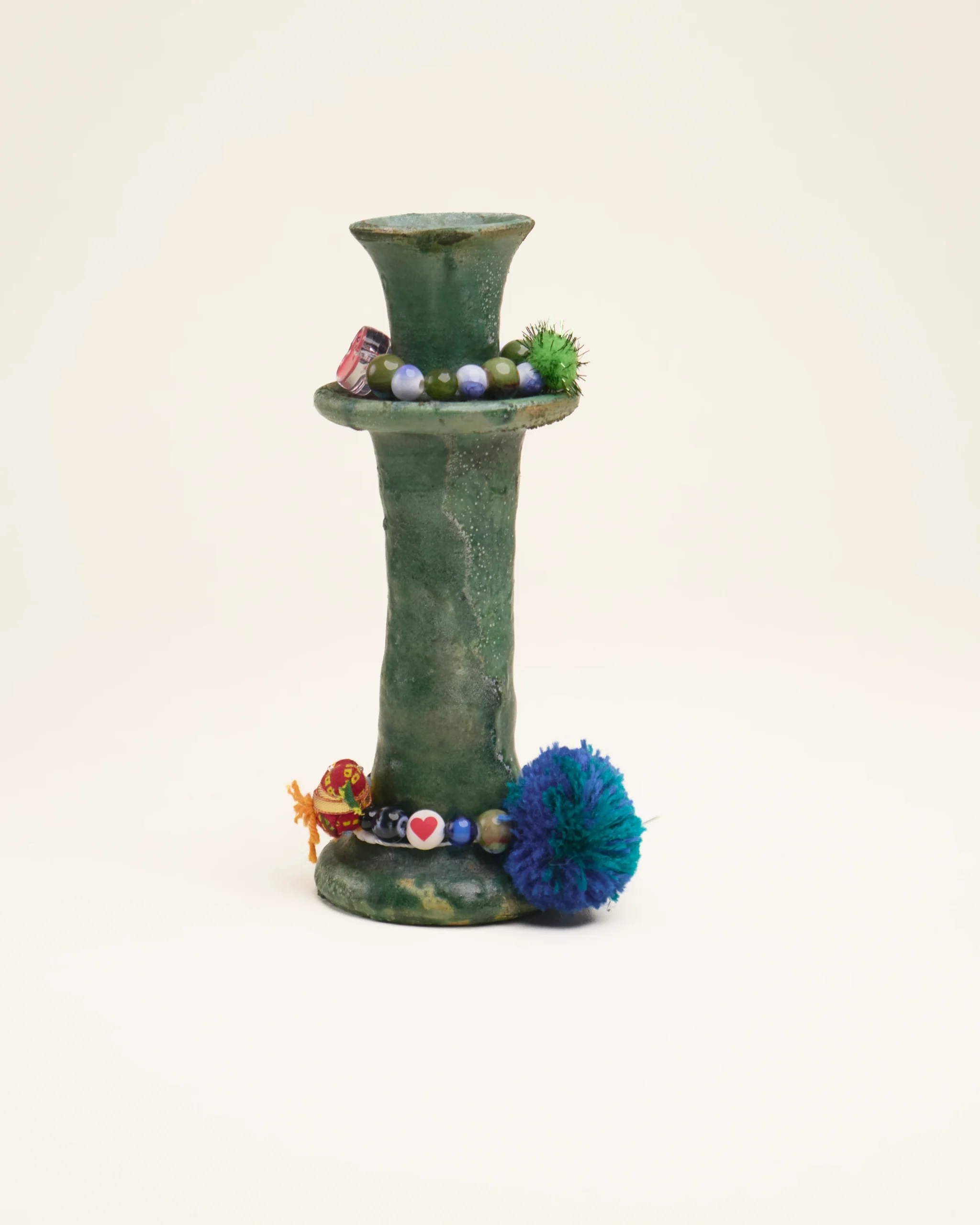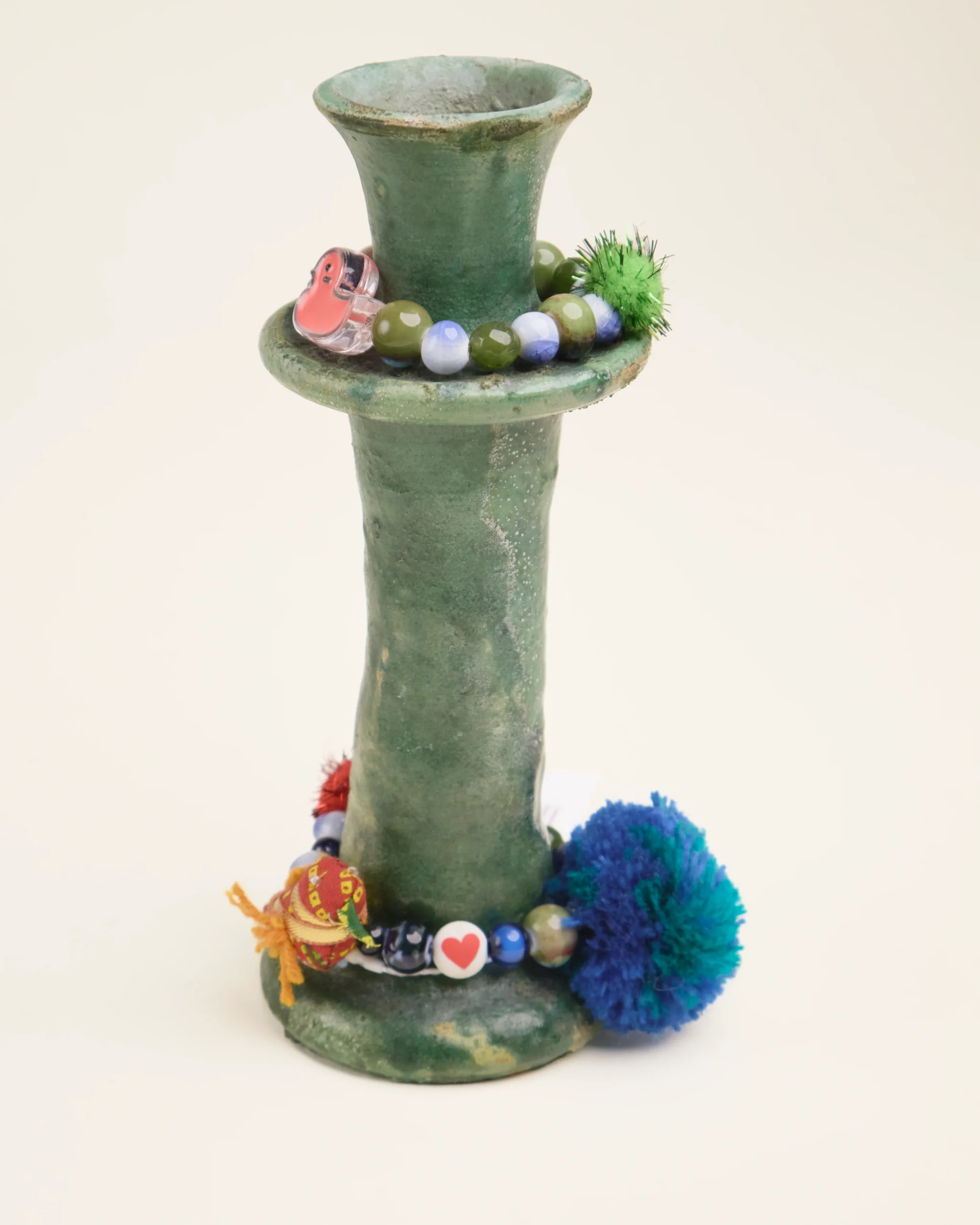 À cette base brute et authentique, Manon vient apporter sa touche personnelle : de délicats bijoux de perles faits main, qu’elle compose avec amour dans son atelier. Ces ornements viennent enlacer le bougeoir, créant une pièce poétique, mêlant terre et lumière, tradition et création.