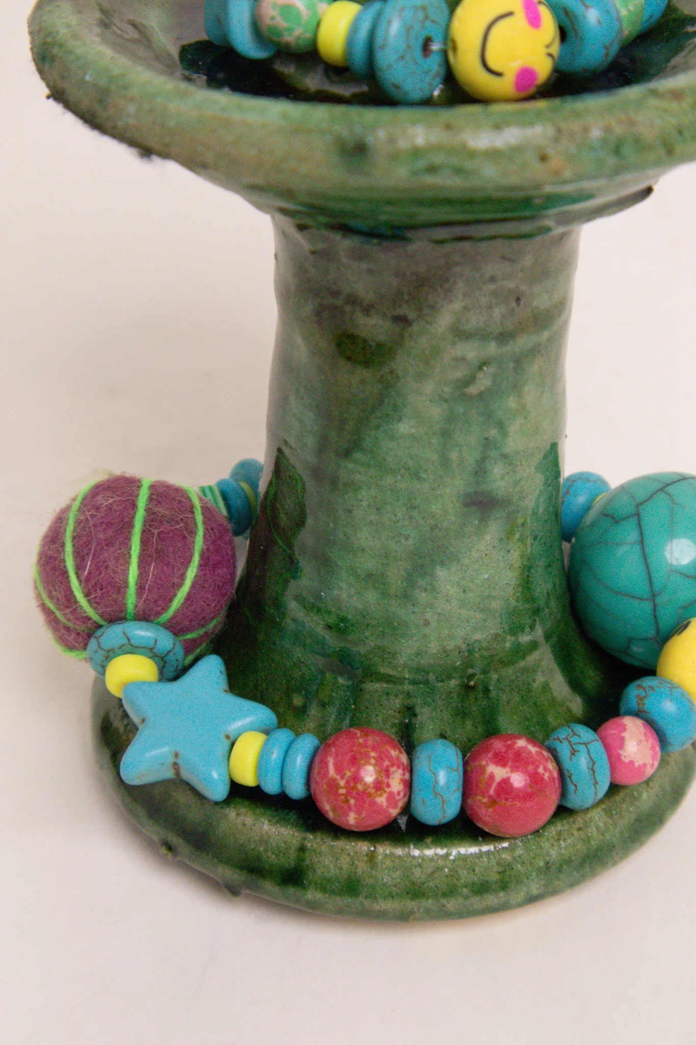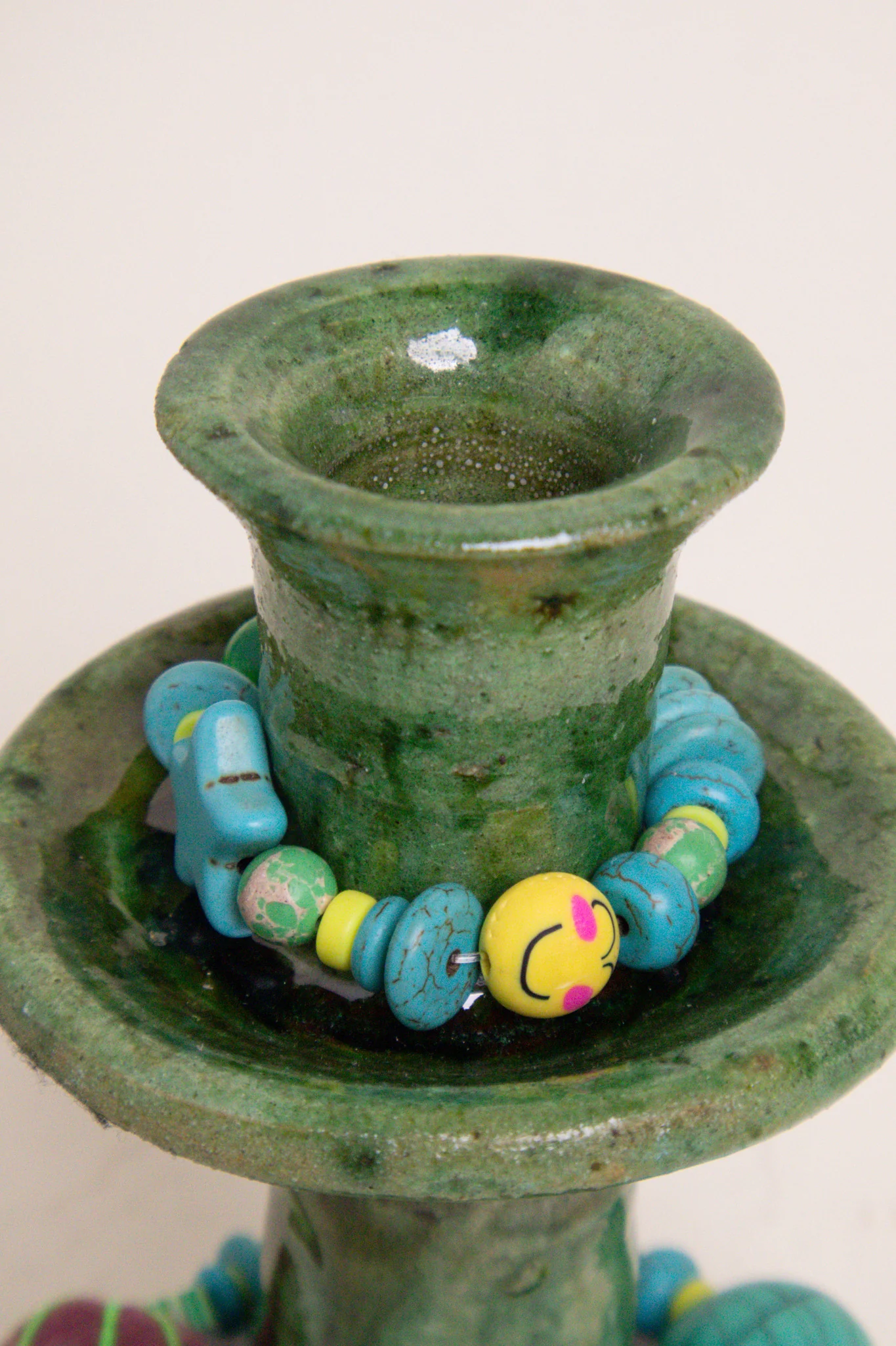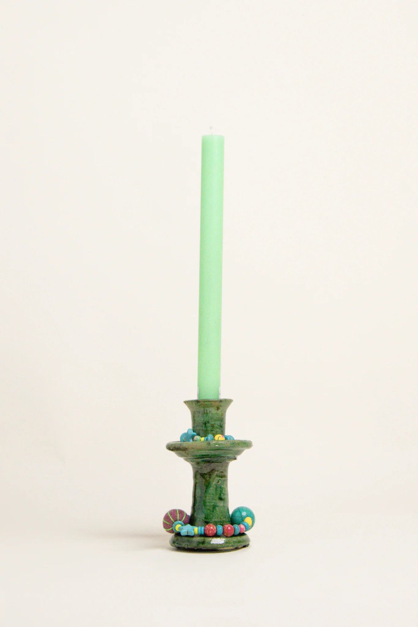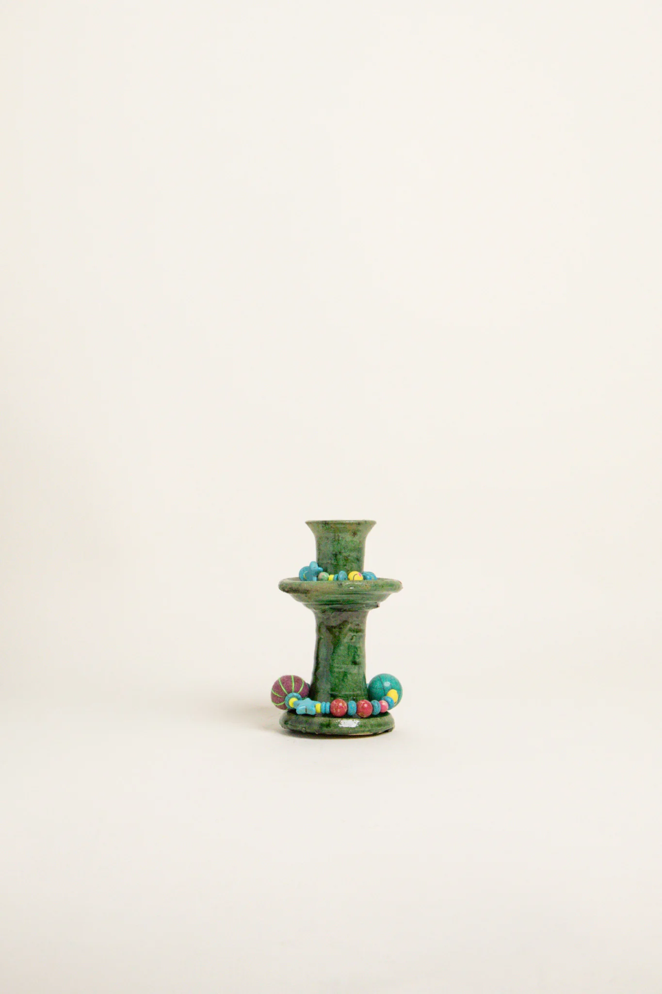 À cette base brute et authentique, Manon vient apporter sa touche personnelle : de délicats bijoux de perles faits main, qu’elle compose avec amour dans son atelier. Ces ornements viennent enlacer le bougeoir, créant une pièce poétique, mêlant terre et lumière, tradition et création.
