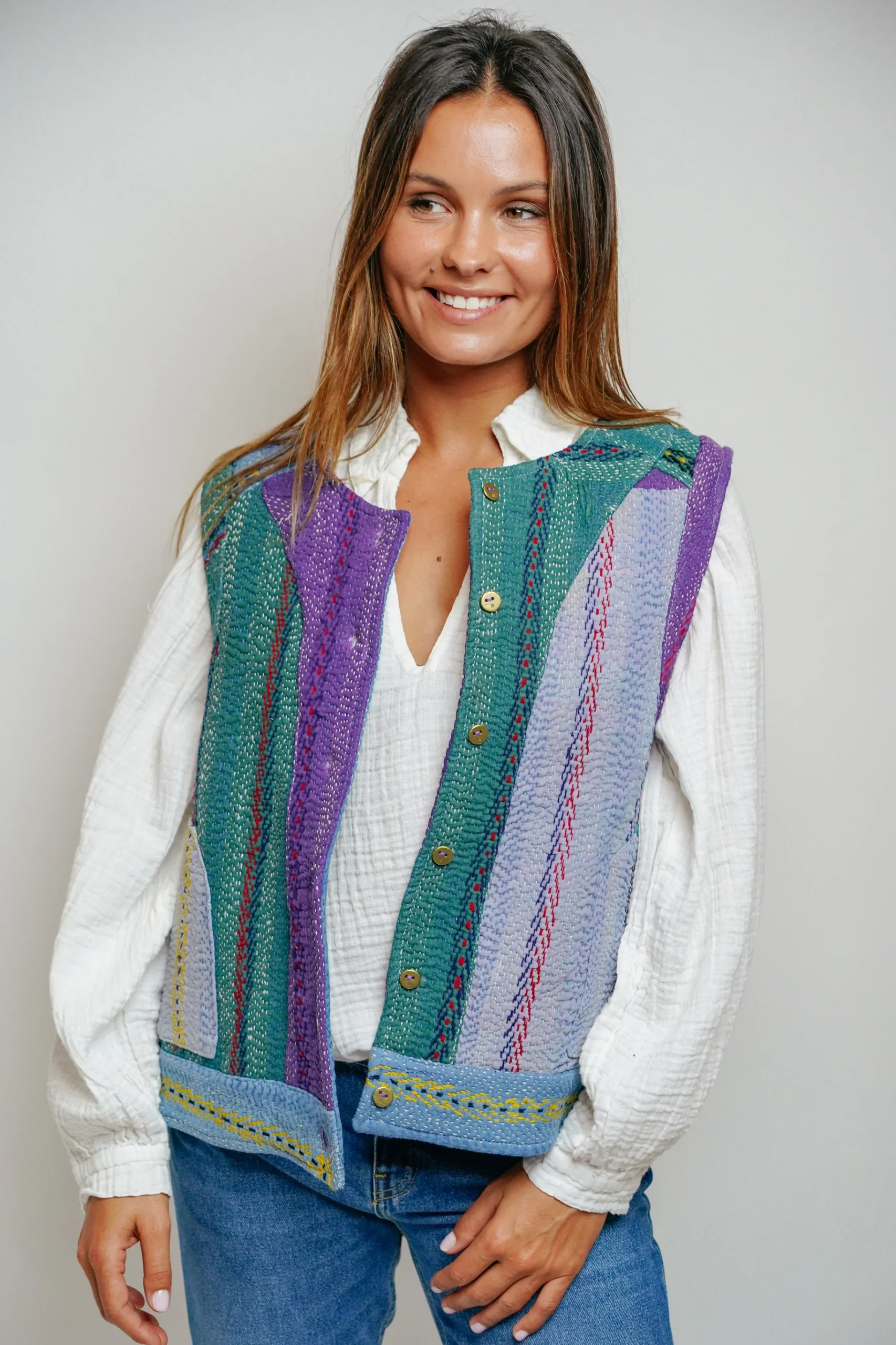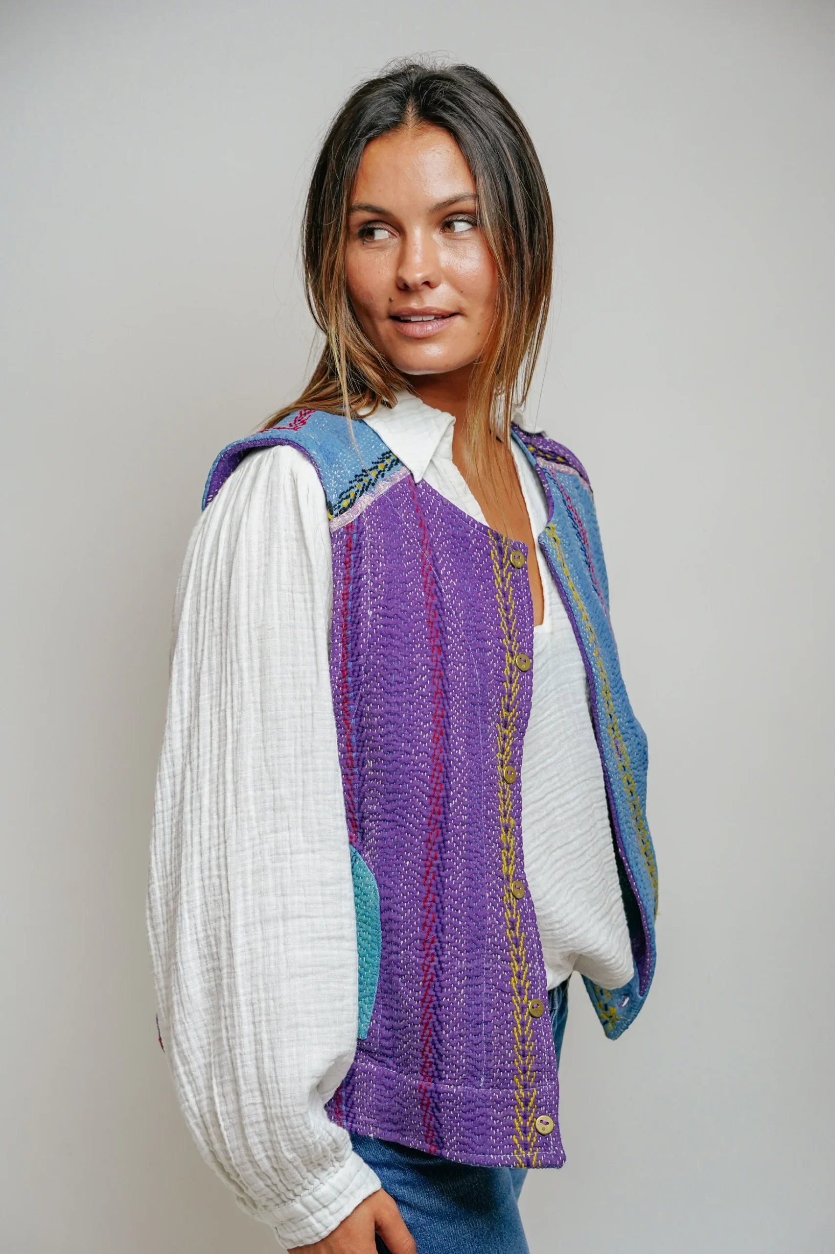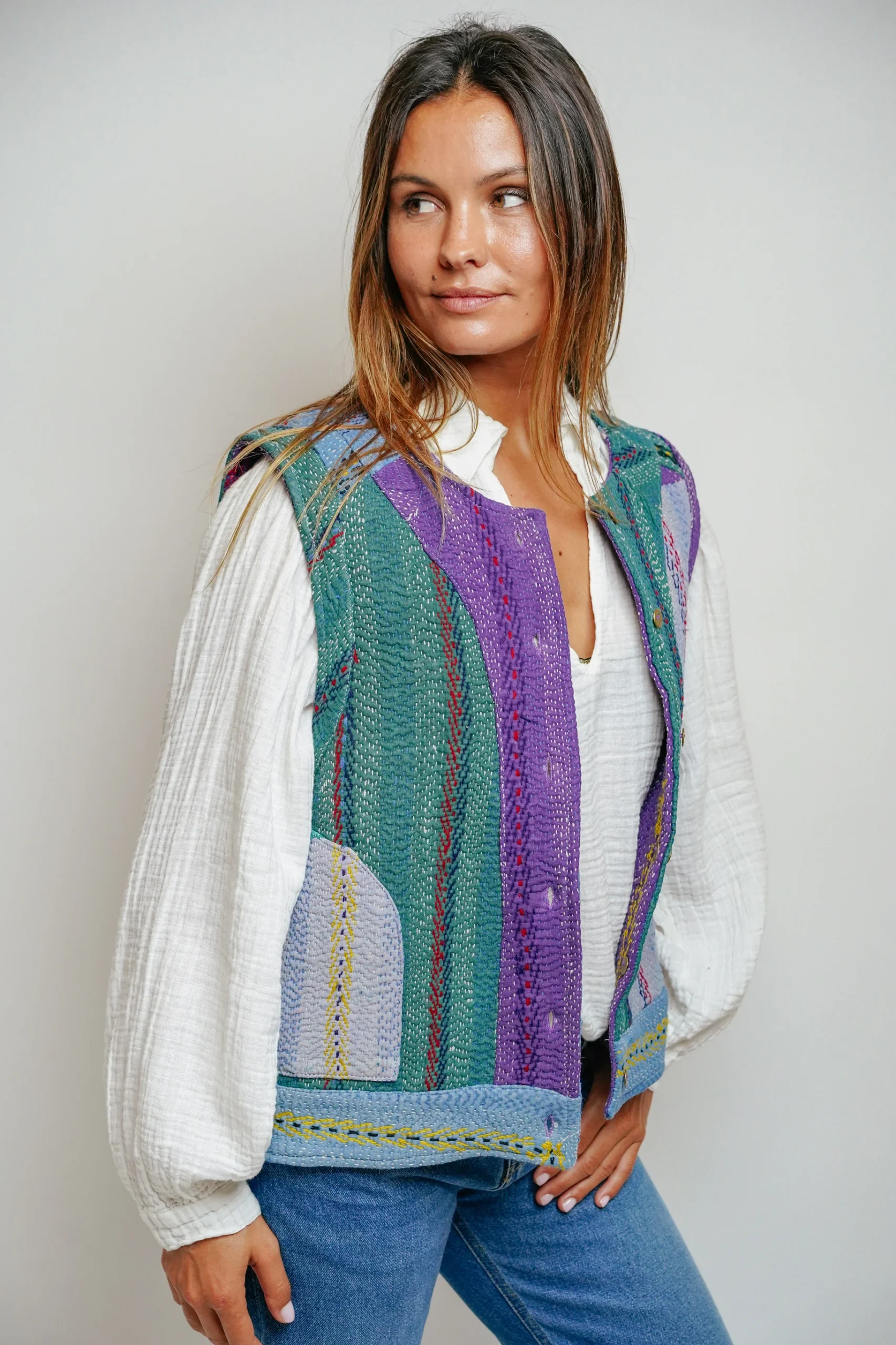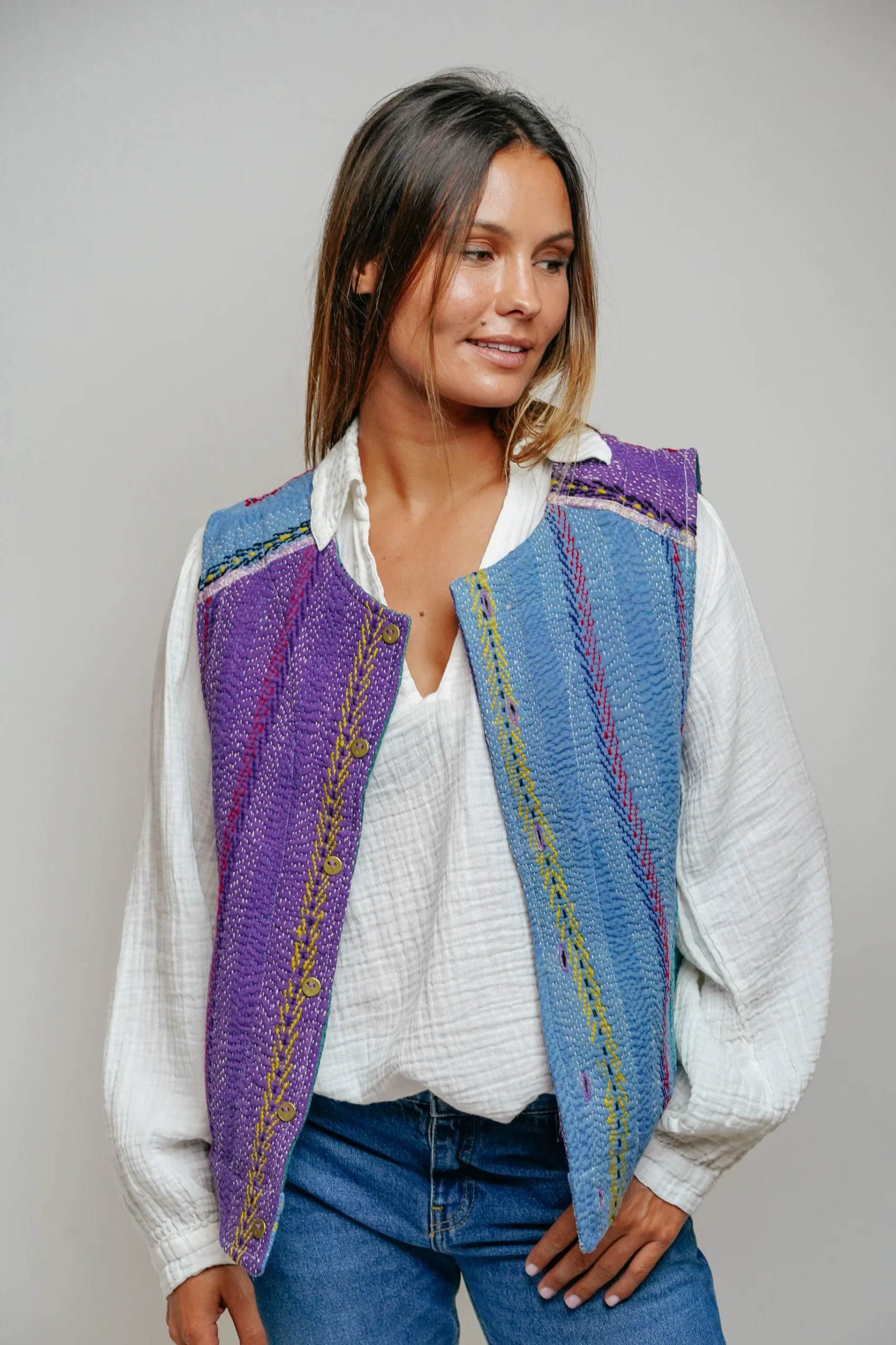 Le gilet Annie est une pièce rare qui célèbre le savoir-faire artisanal et l’élégance intemporelle. Imaginé à Bordeaux puis confectionné avec soin dans un atelier en Inde, il associe la richesse du Kantha – une technique traditionnelle de couture indienne – à la délicatesse des broderies Suzani, emblématiques d’Asie centrale.