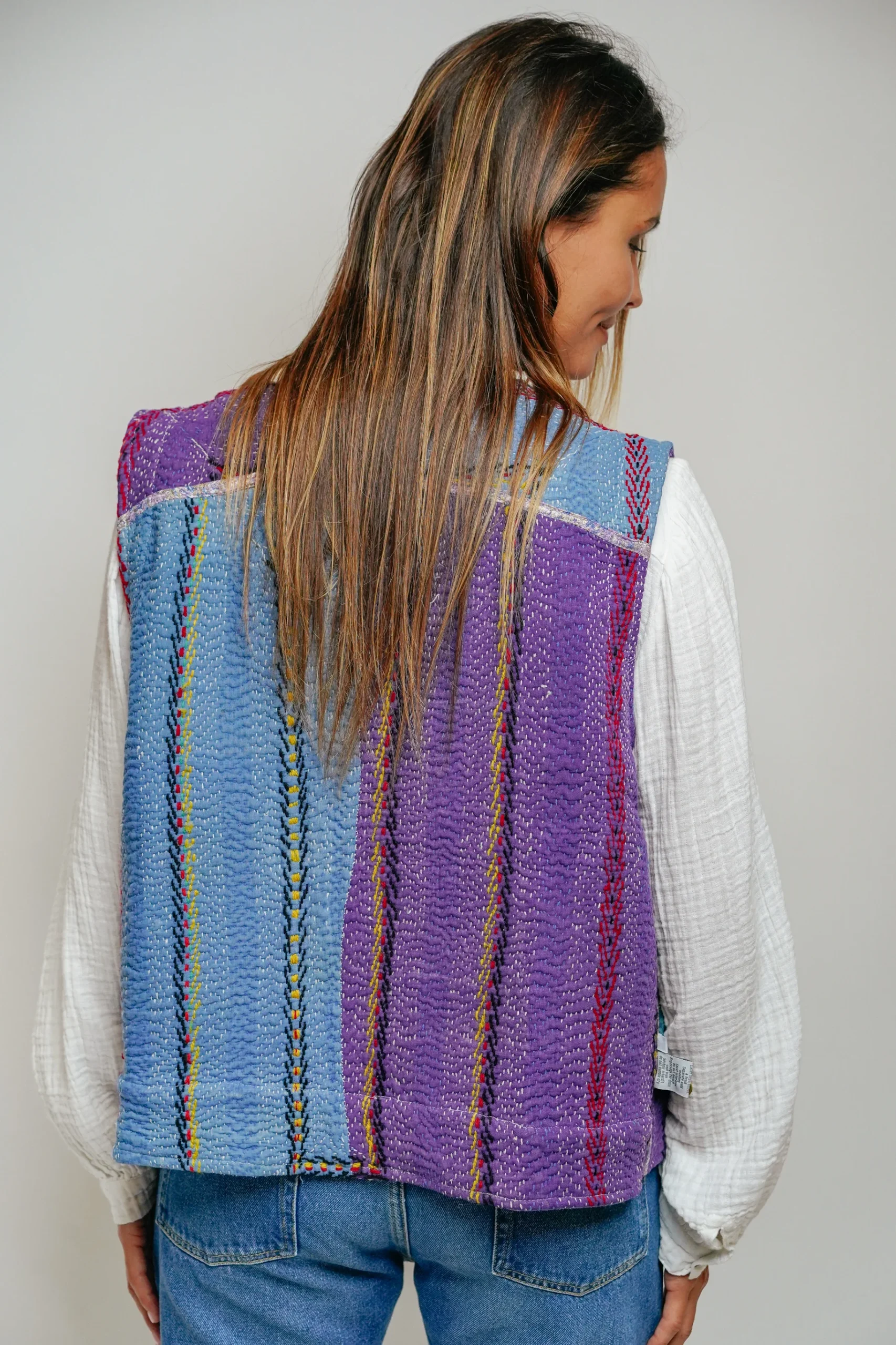 Réversible, il offre deux styles en un : un côté richement orné et coloré, l’autre plus sobre et texturé, permettant de varier les looks avec une seule pièce. Sa coupe sans manches en fait un vêtement facile à superposer, aussi bien sur une robe fluide que sur un simple jean et un t-shirt.