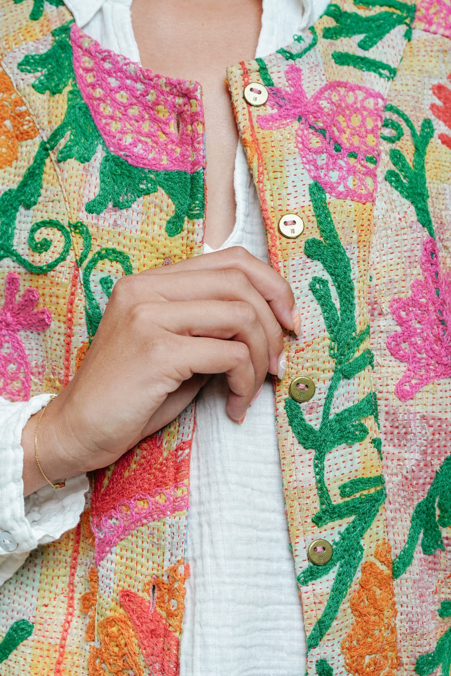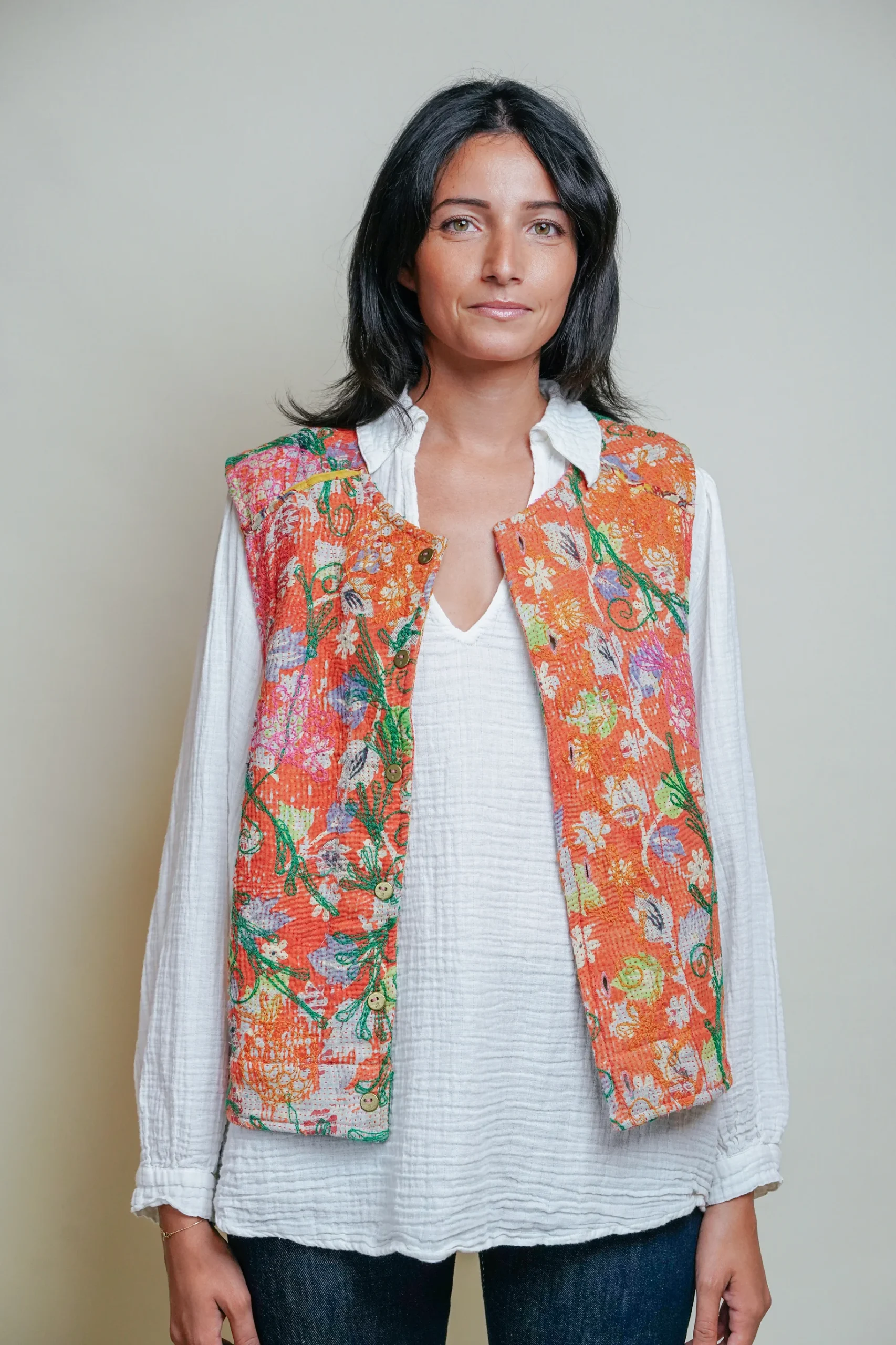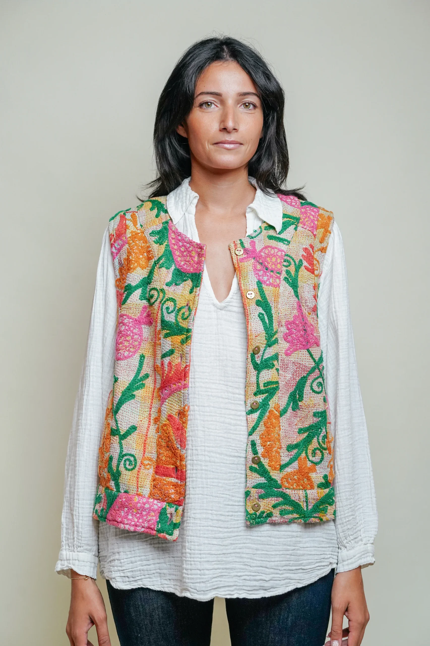 Le gilet Annie est une pièce rare qui célèbre le savoir-faire artisanal et l’élégance intemporelle. Imaginé à Bordeaux puis confectionné avec soin dans un atelier en Inde, il associe la richesse du Kantha – une technique traditionnelle de couture indienne – à la délicatesse des broderies Suzani, emblématiques d’Asie centrale.