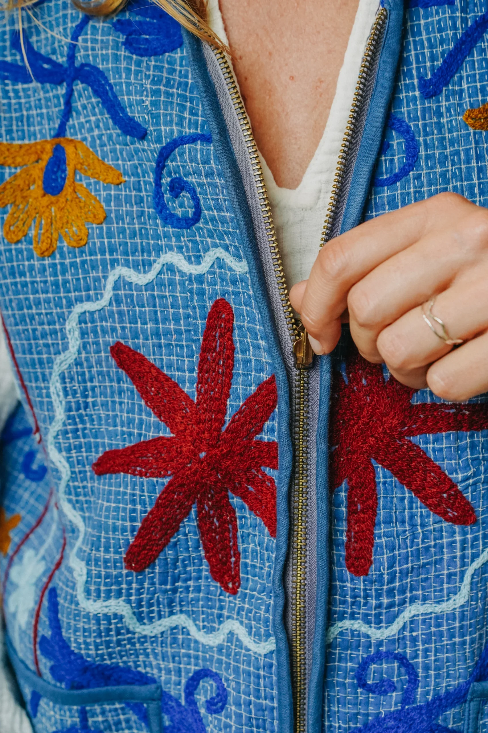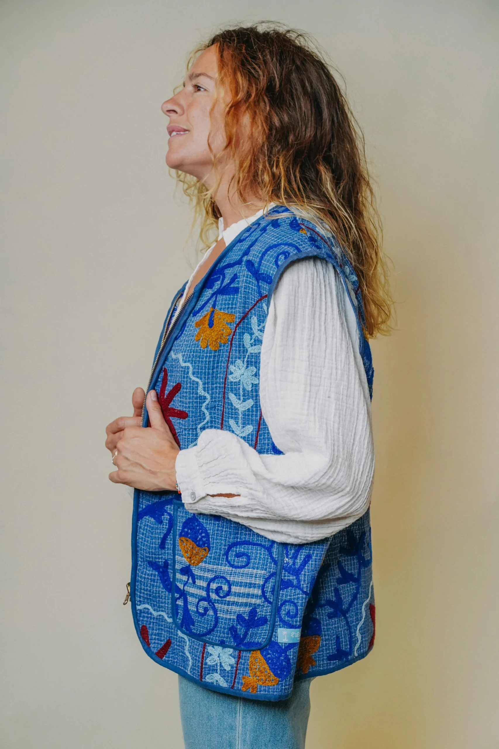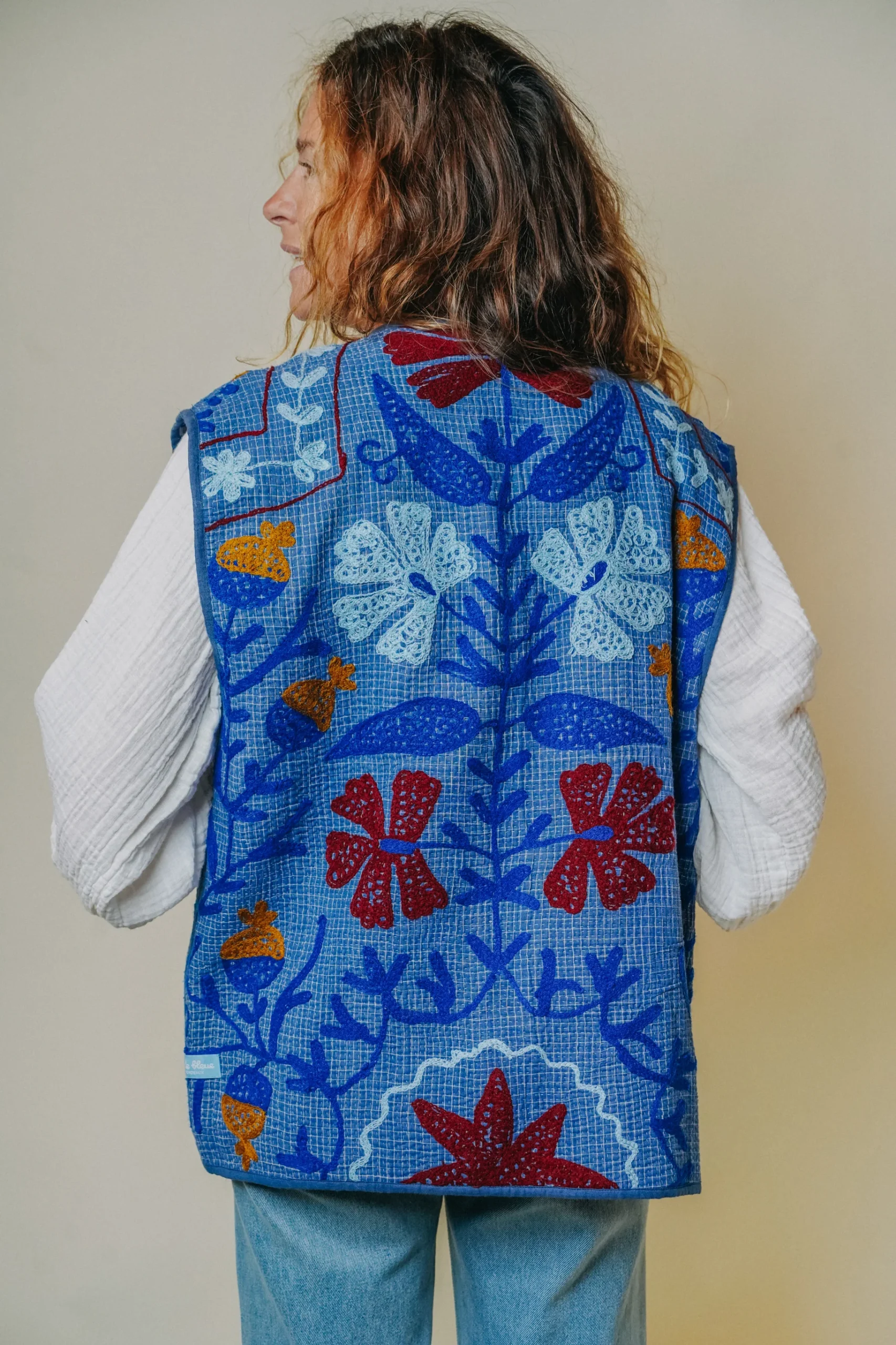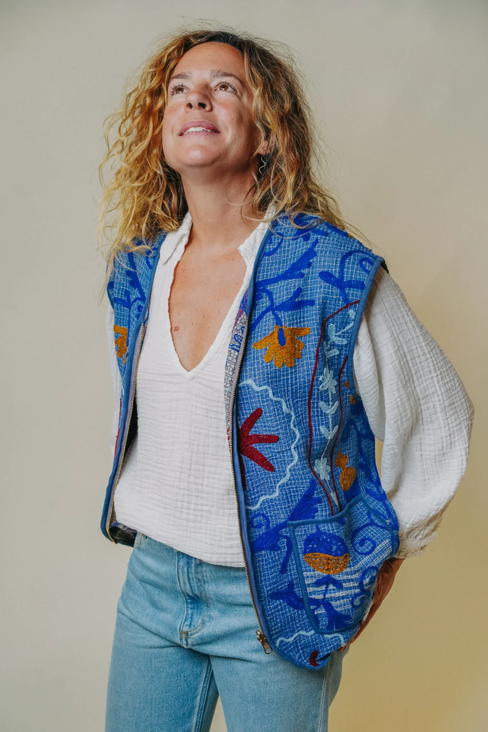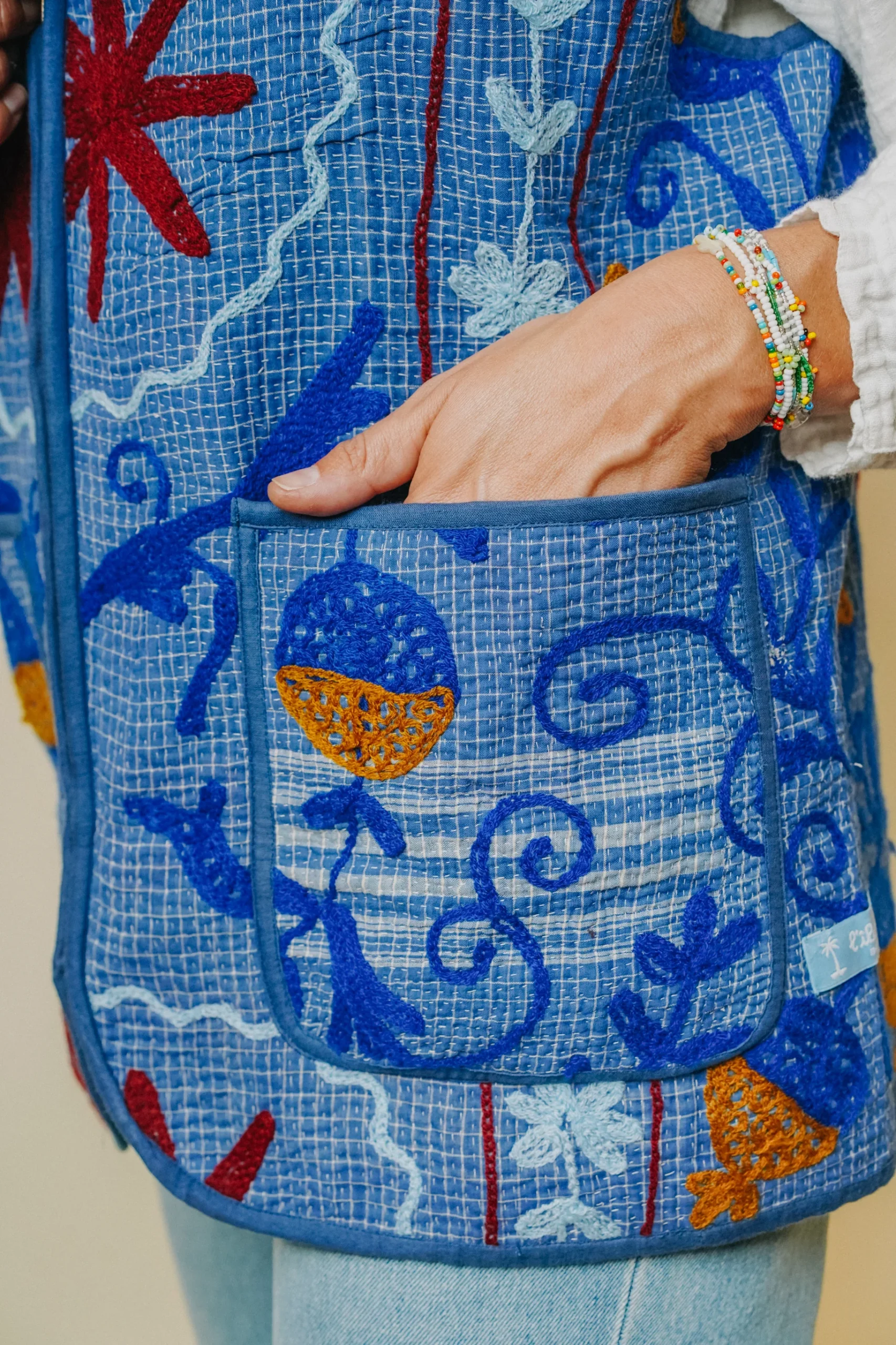 Ici, le gilet sans manches Arthur est dans un kantha bleu marine avec des broderies Suzani dans les tons bleus et orange.