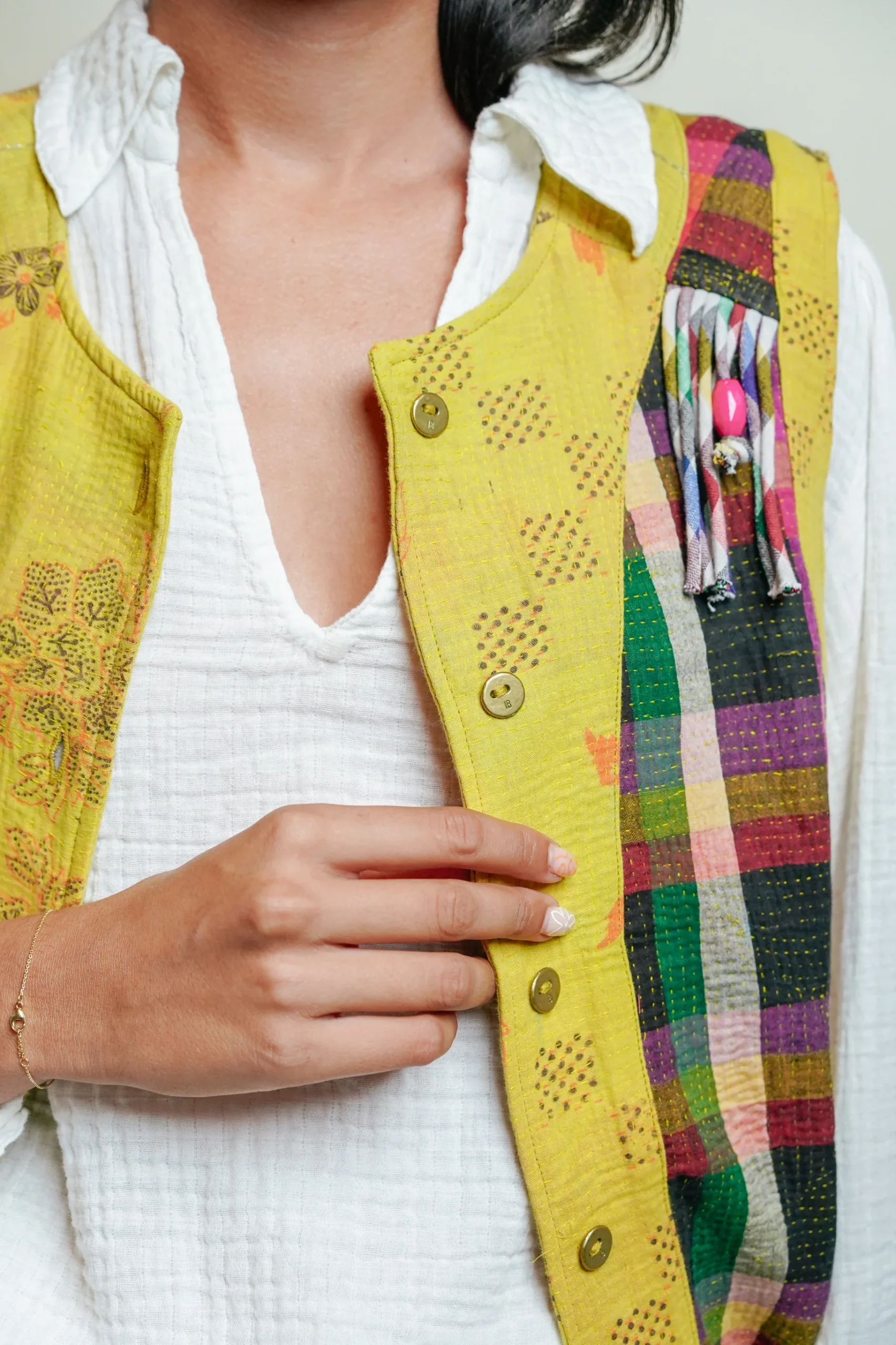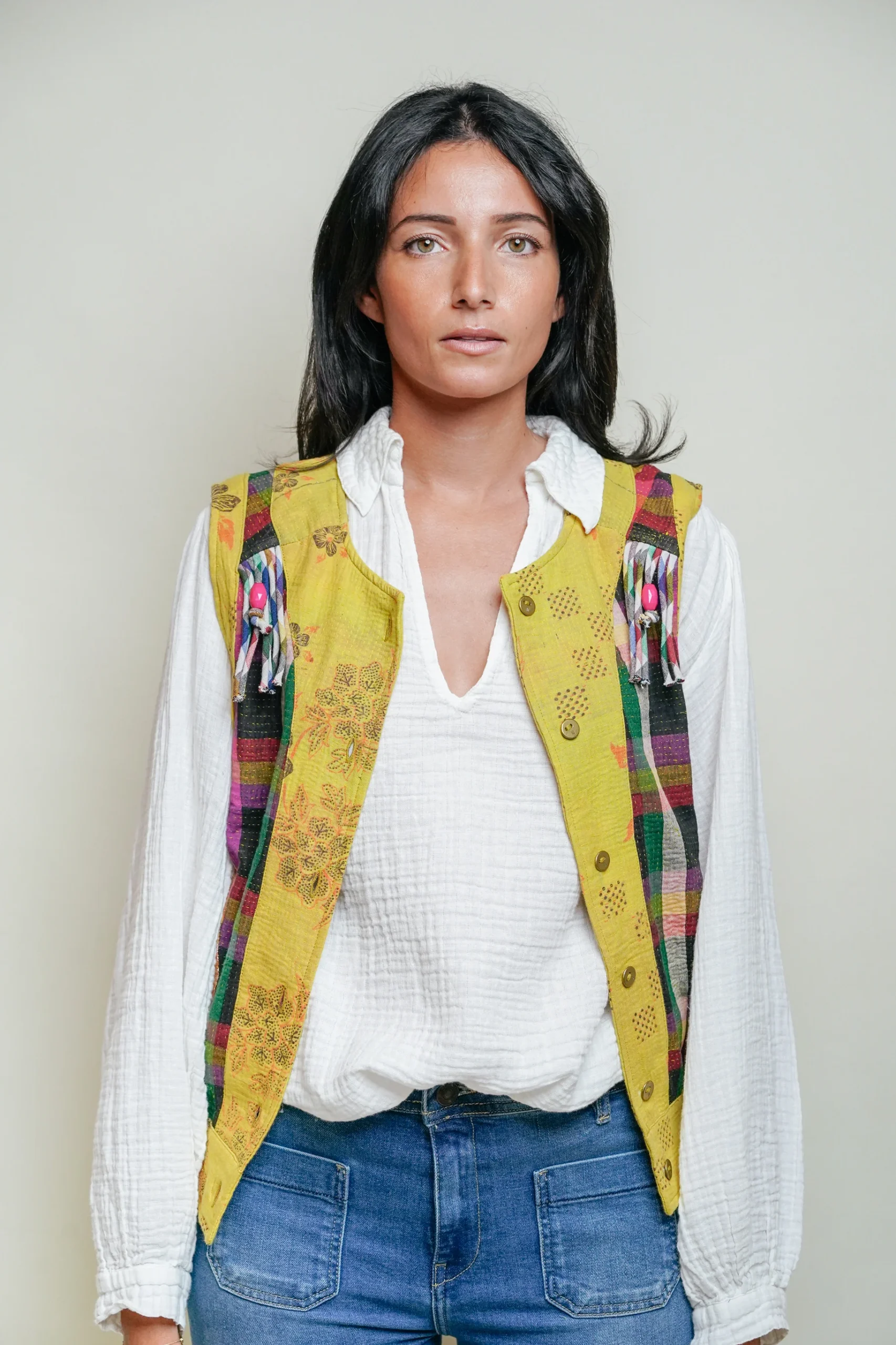 Pièce forte de l’été, ce gilet en kantha revisite un savoir-faire ancestral avec une touche contemporaine et festive. Imaginé en France et confectionné à la main en Inde, chaque modèle est unique.