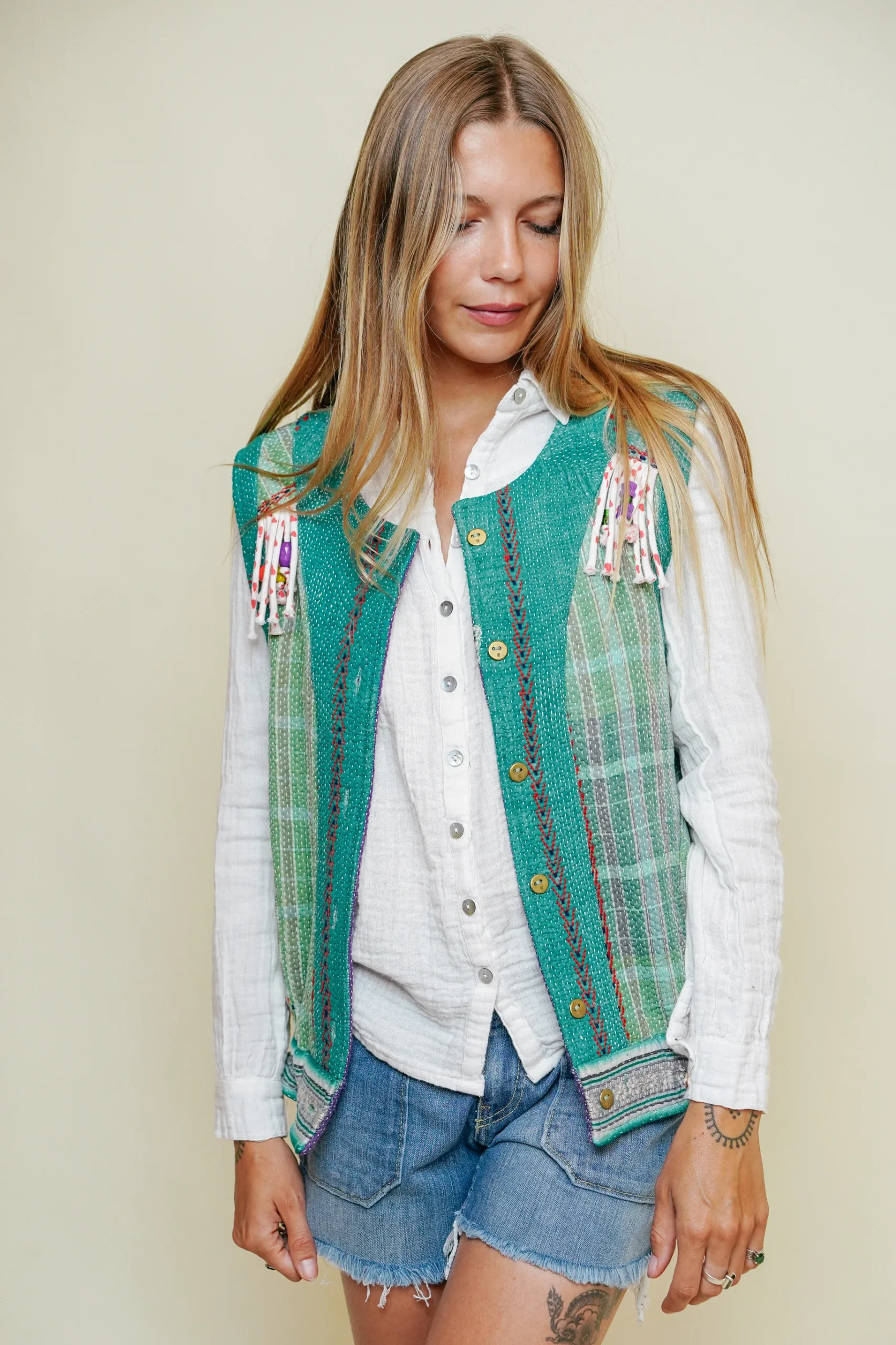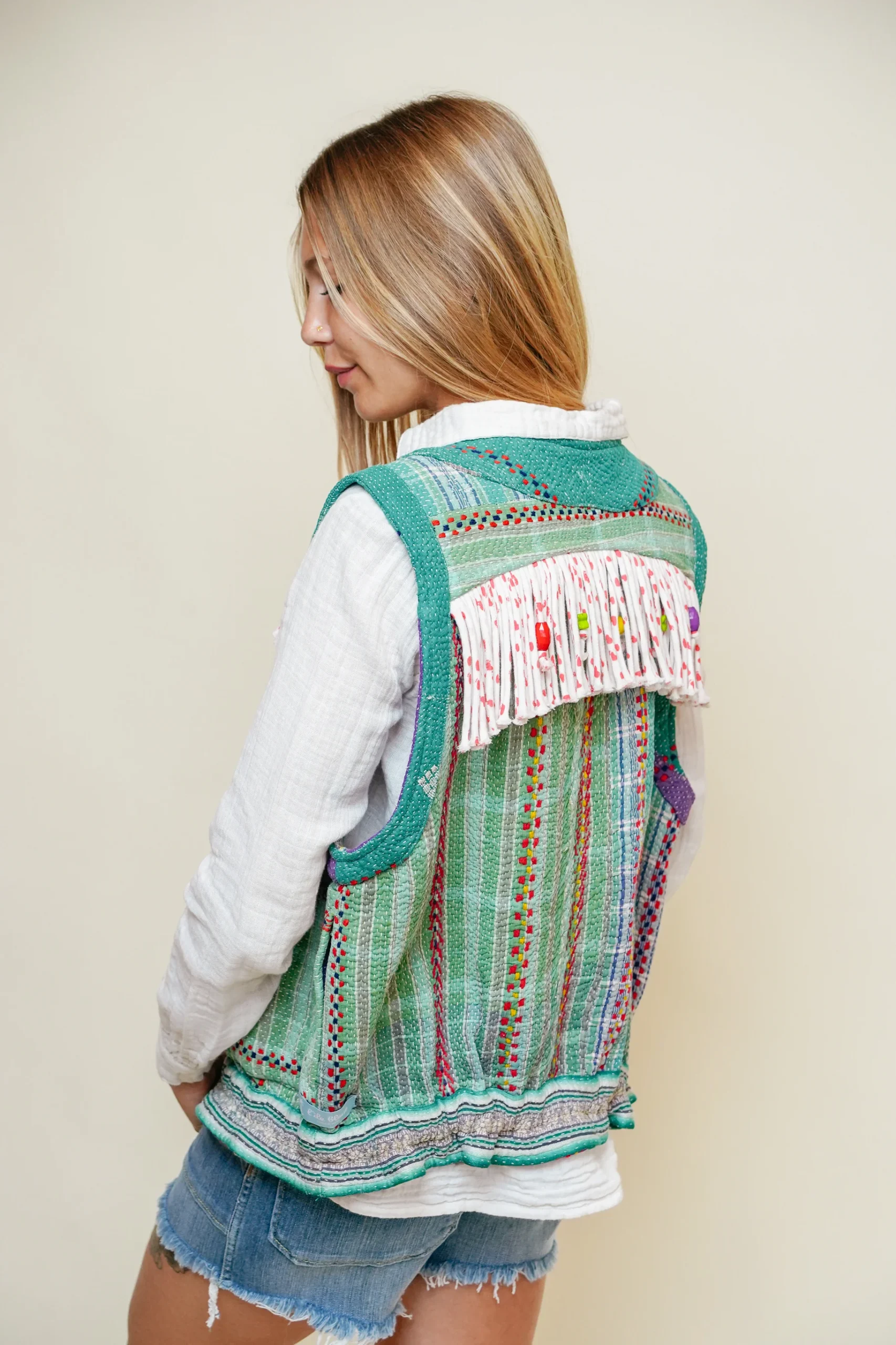L’ÎLE BLEUE – Gilet Kantha – Franges