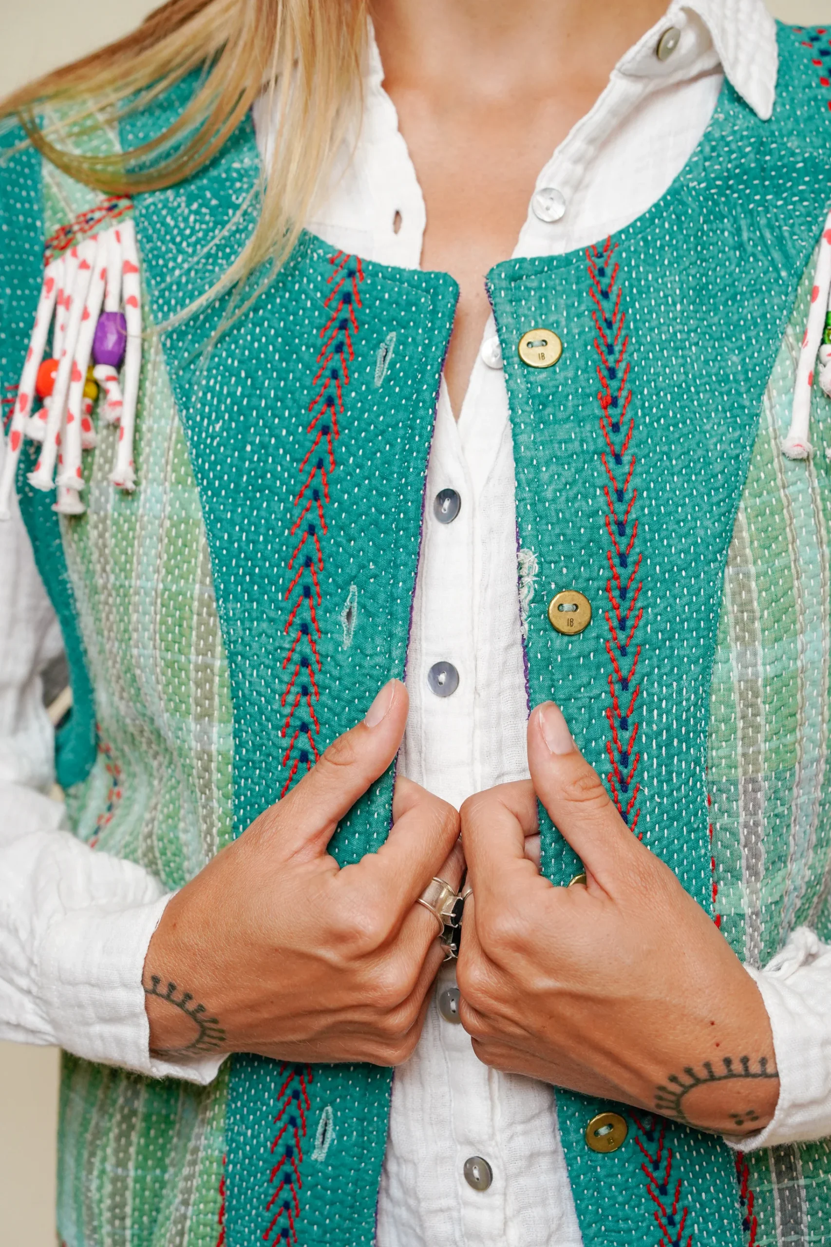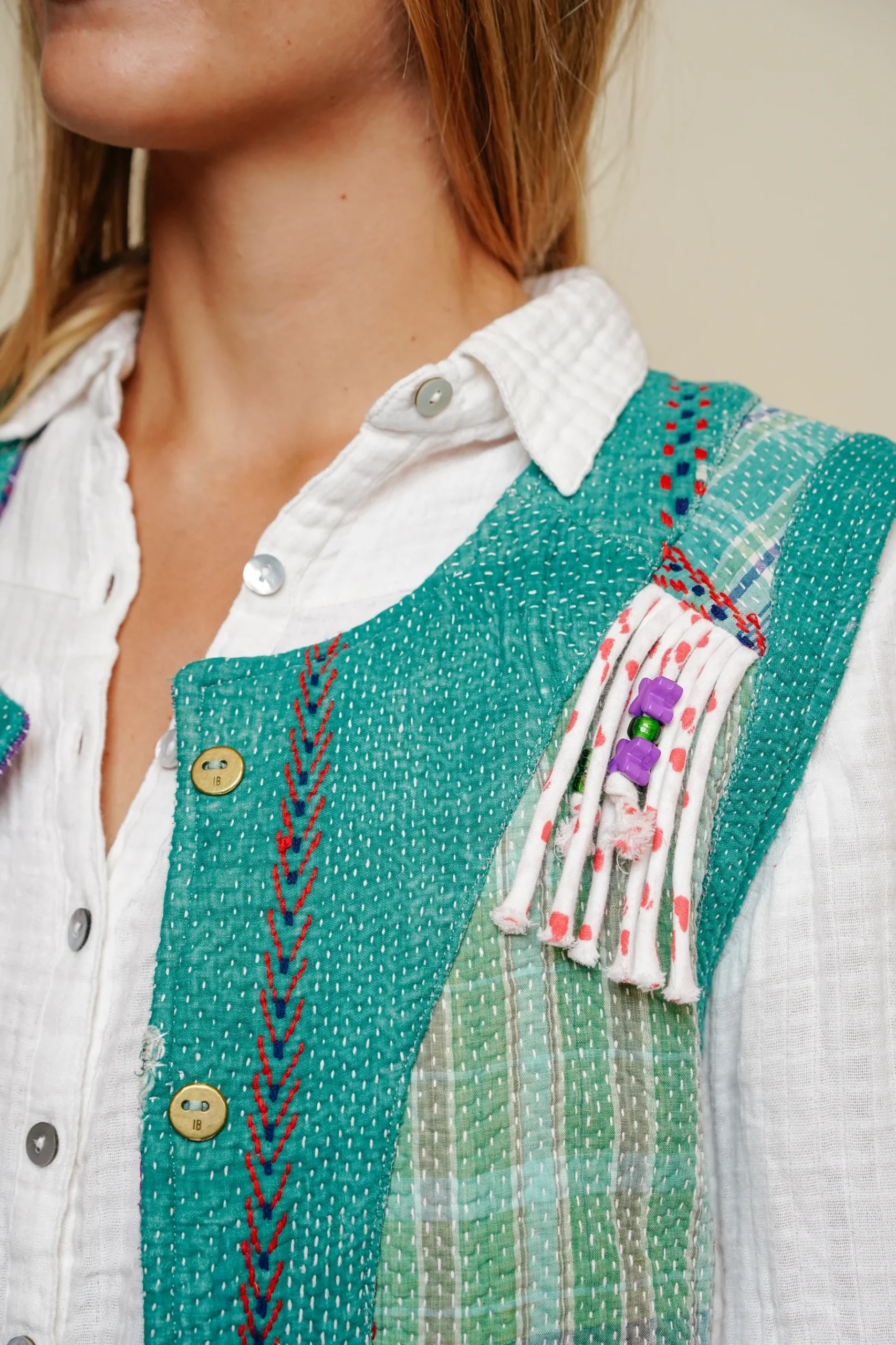 La grande nouveauté de cette saison ? Les franges en kantha habillées de perles, cousues en frise tout le long du dos et à l’avant au niveau de la poitrine. Un détail original et raffiné qui attire la lumière et donne du relief à la pièce. Le gilet est entièrement réversible : l’envers, plus sobre, sans franges, permet un porté plus épuré selon vos envies.