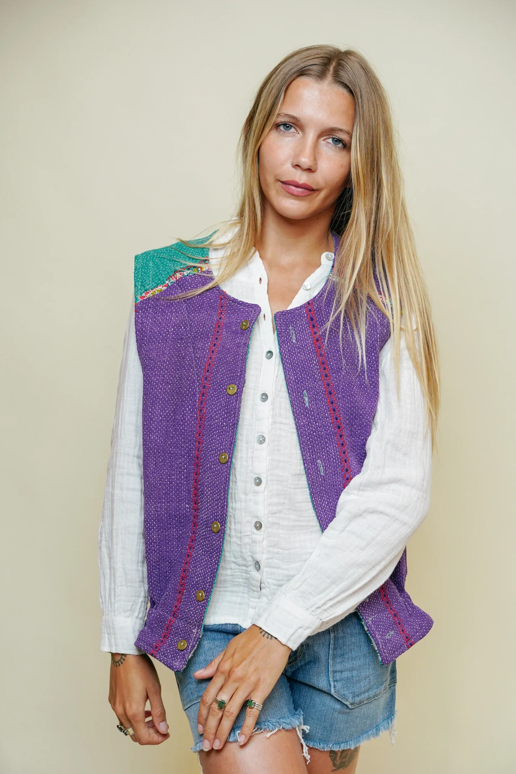 Pièce forte de l’été, ce gilet en kantha revisite un savoir-faire ancestral avec une touche contemporaine et festive. Imaginé en France et confectionné à la main en Inde, chaque modèle est unique.