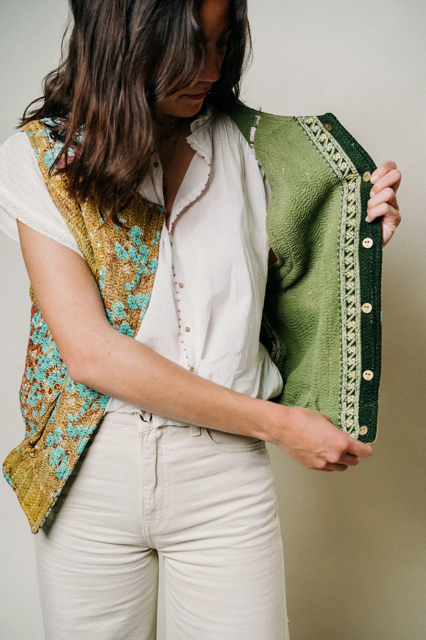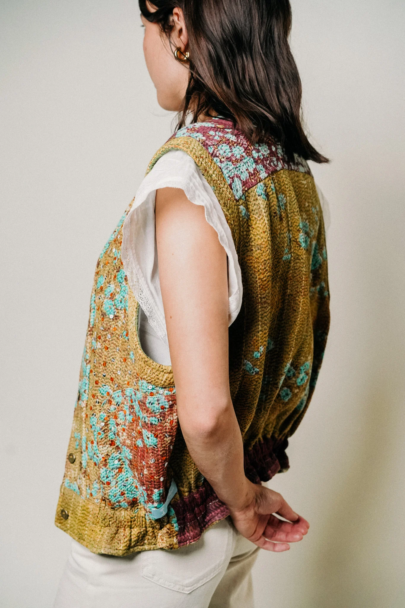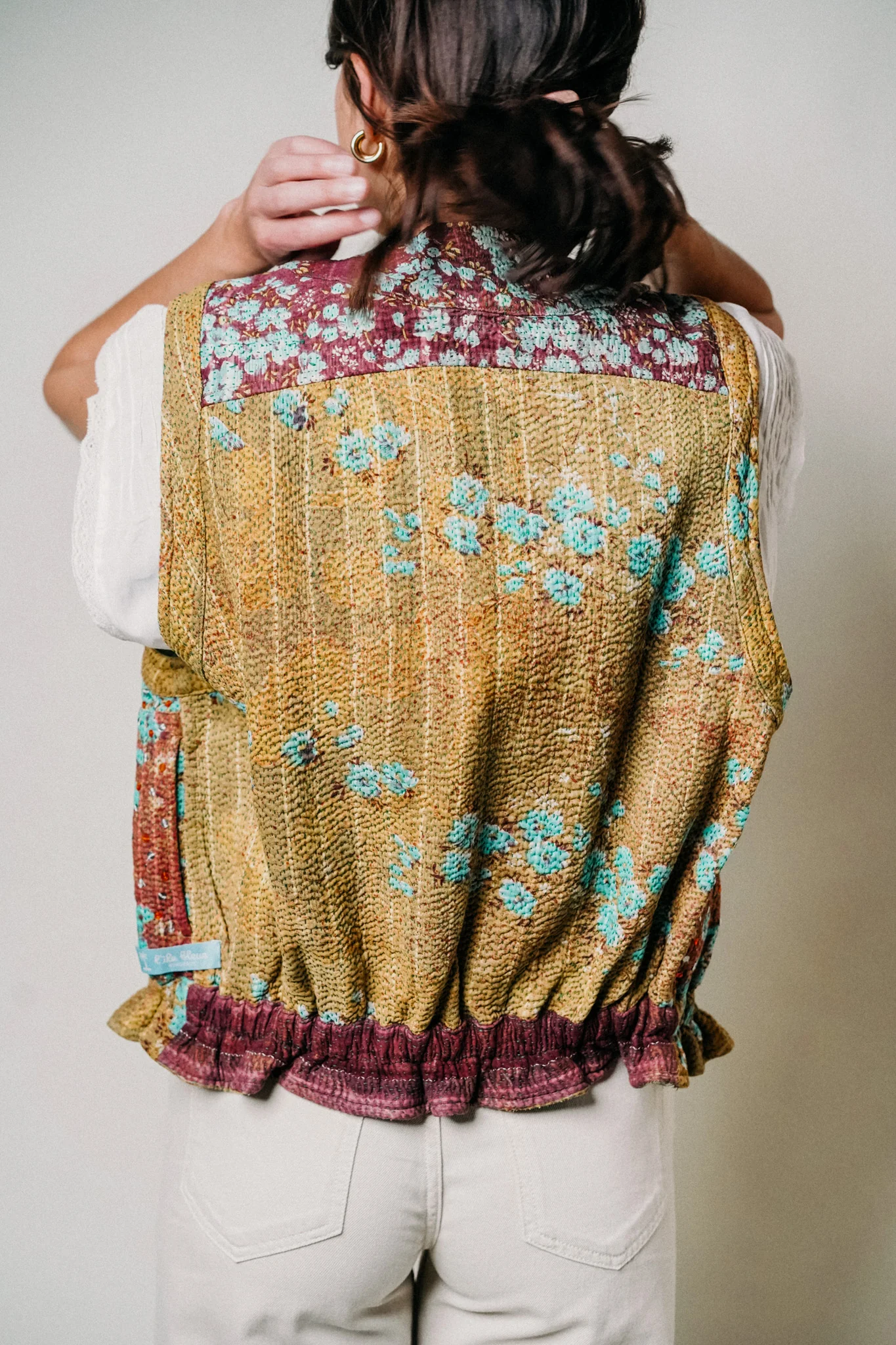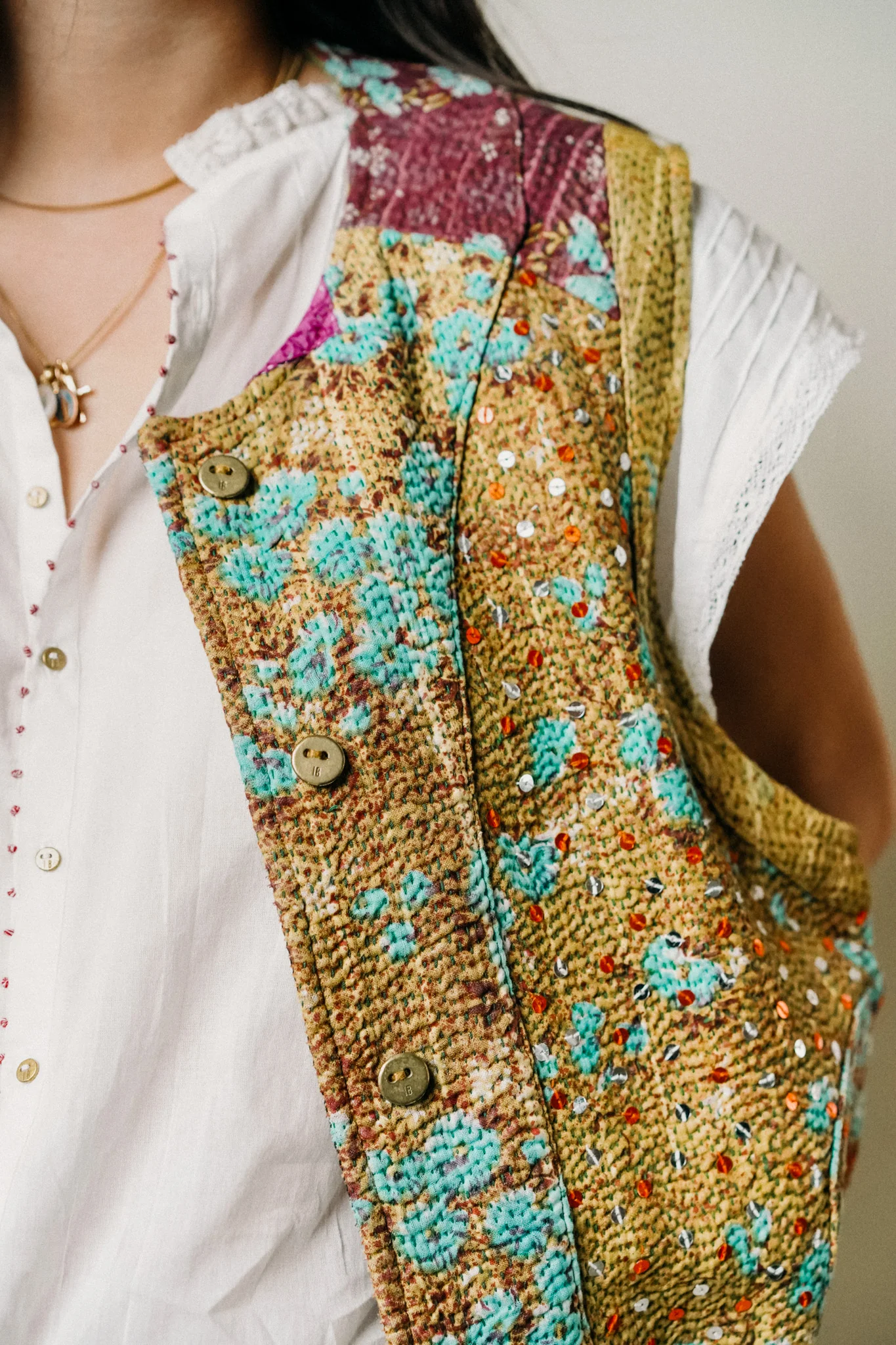 Le kantha nous vient tout droit d’Inde, aussi connu comme tissu utilisé pour réparer les saris. Le Suzani est la broderie qui crée le relief sur nos gilets sans manches.