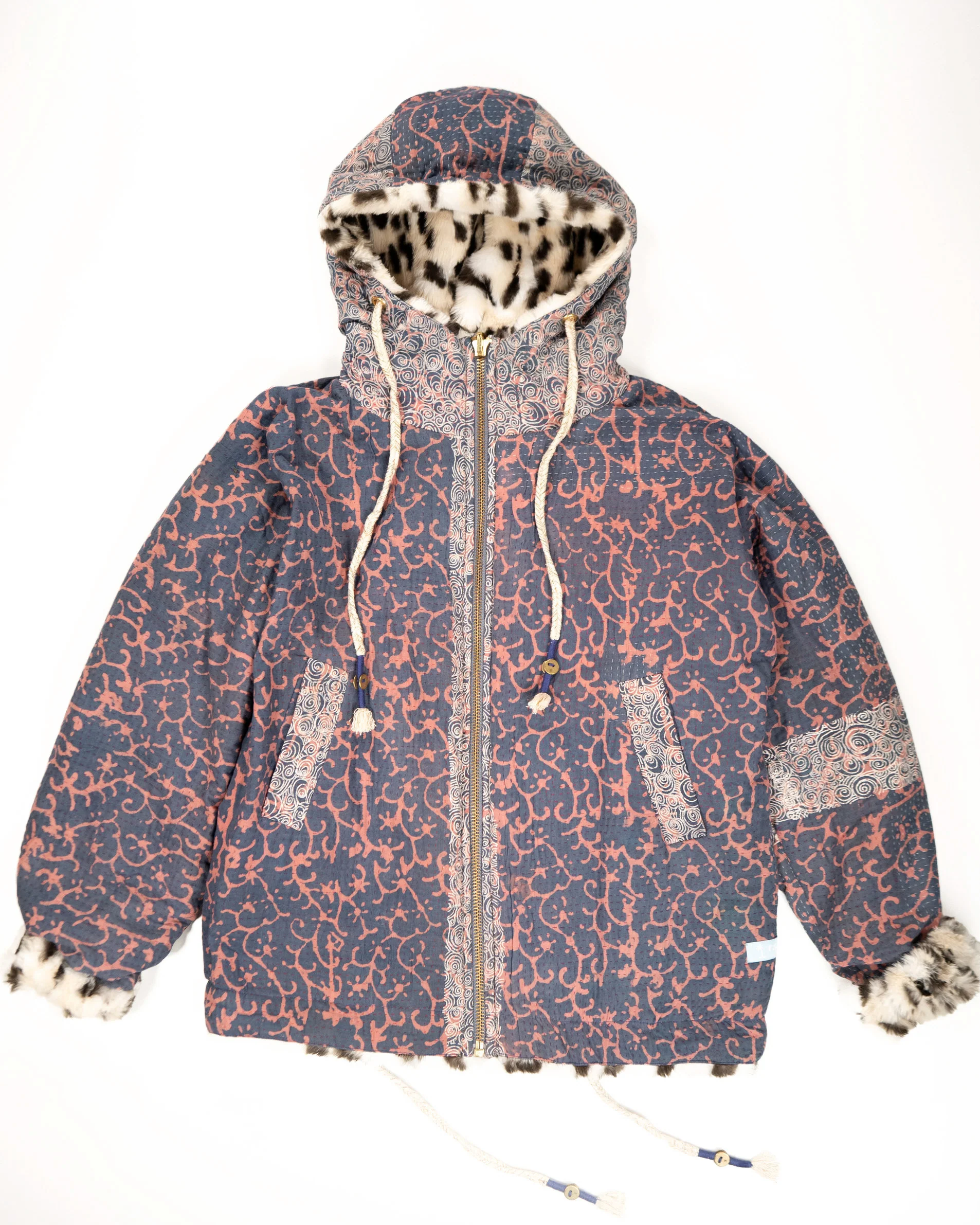Le manteau hoodie réversible fourré Léopard en Kantha de L’Île Bleue est une pièce unique. Doublé pour offrir chaleur et confort, il enveloppe agréablement tout en protégeant du froid. La capuche et la coupe étudiée assurent un maintien optimal, tandis que les motifs léopard et l’artisanat Kantha apportent authenticité et originalité. Chaque détail est soigneusement travaillé, faisant de ce manteau un vêtement unique, moderne et plein de caractère.