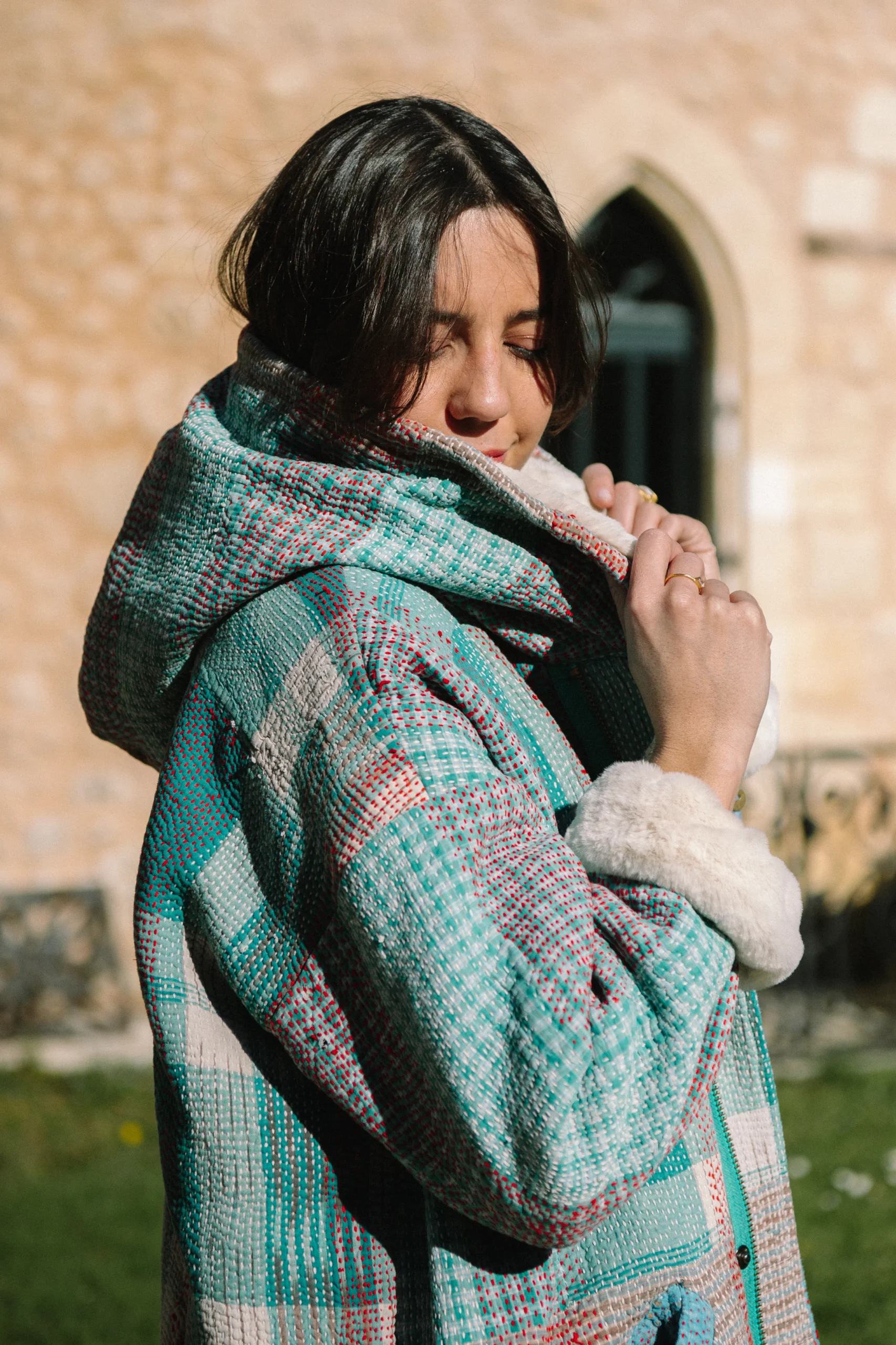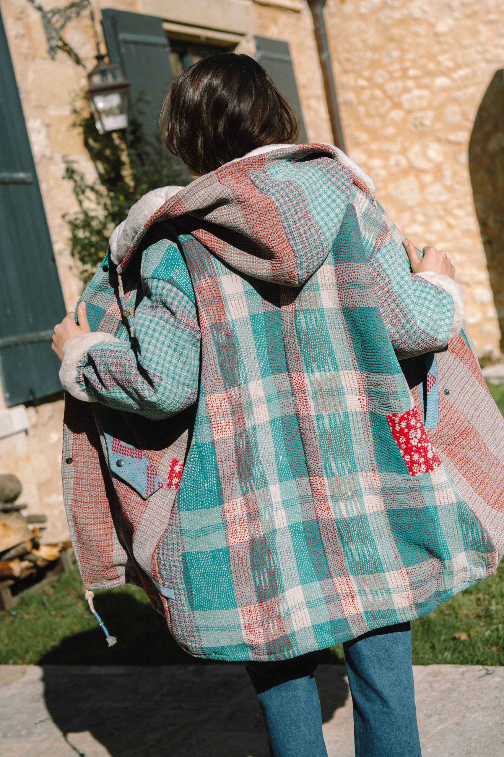 Nos nouveaux manteaux longs fait dans notre traditionnel kantha, doublé en pilou-pilou léopard, avec une capuche toute douce. Des cordons de serrages pailletés vous permettent d’ajuster la capuche et le bas du manteau. Les poignets sont élastiqués pour bien vous isoler du froid. Solveig mesure 1,78 m et porte une taille unique. Tous nos manteaux […]