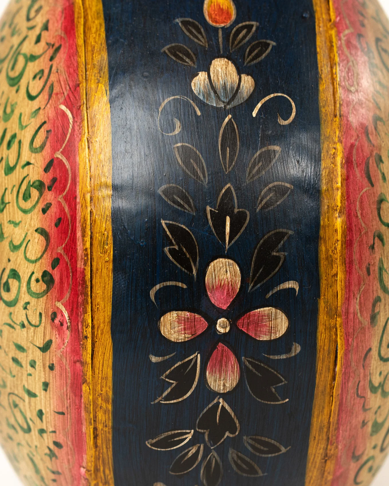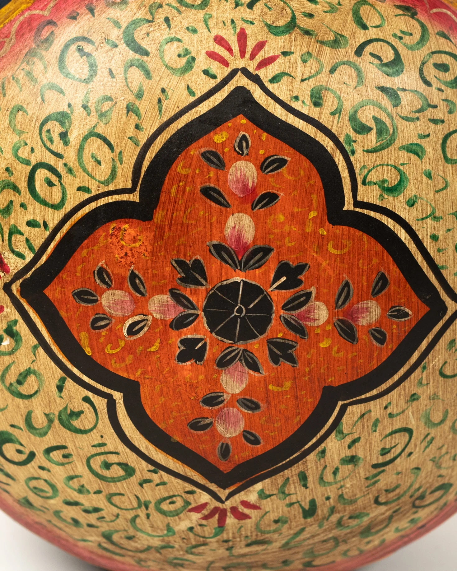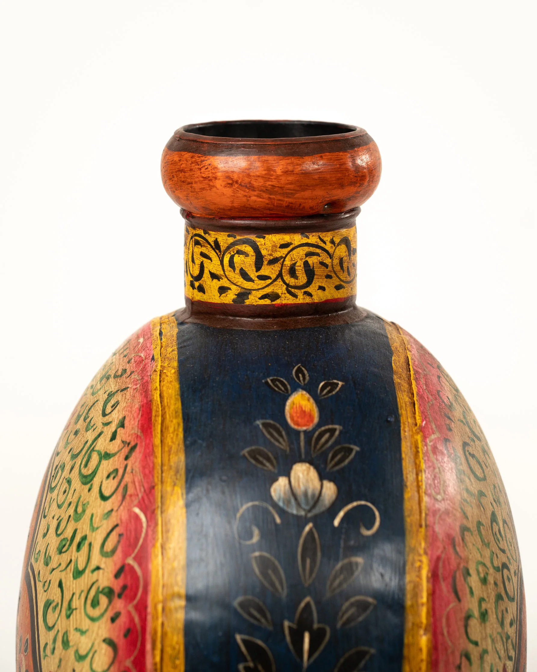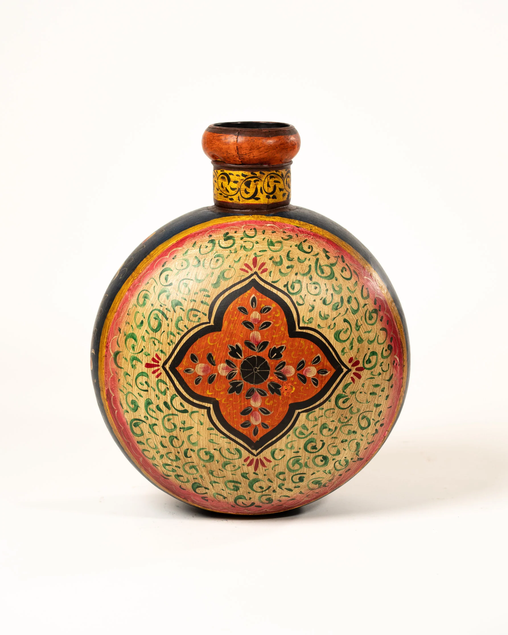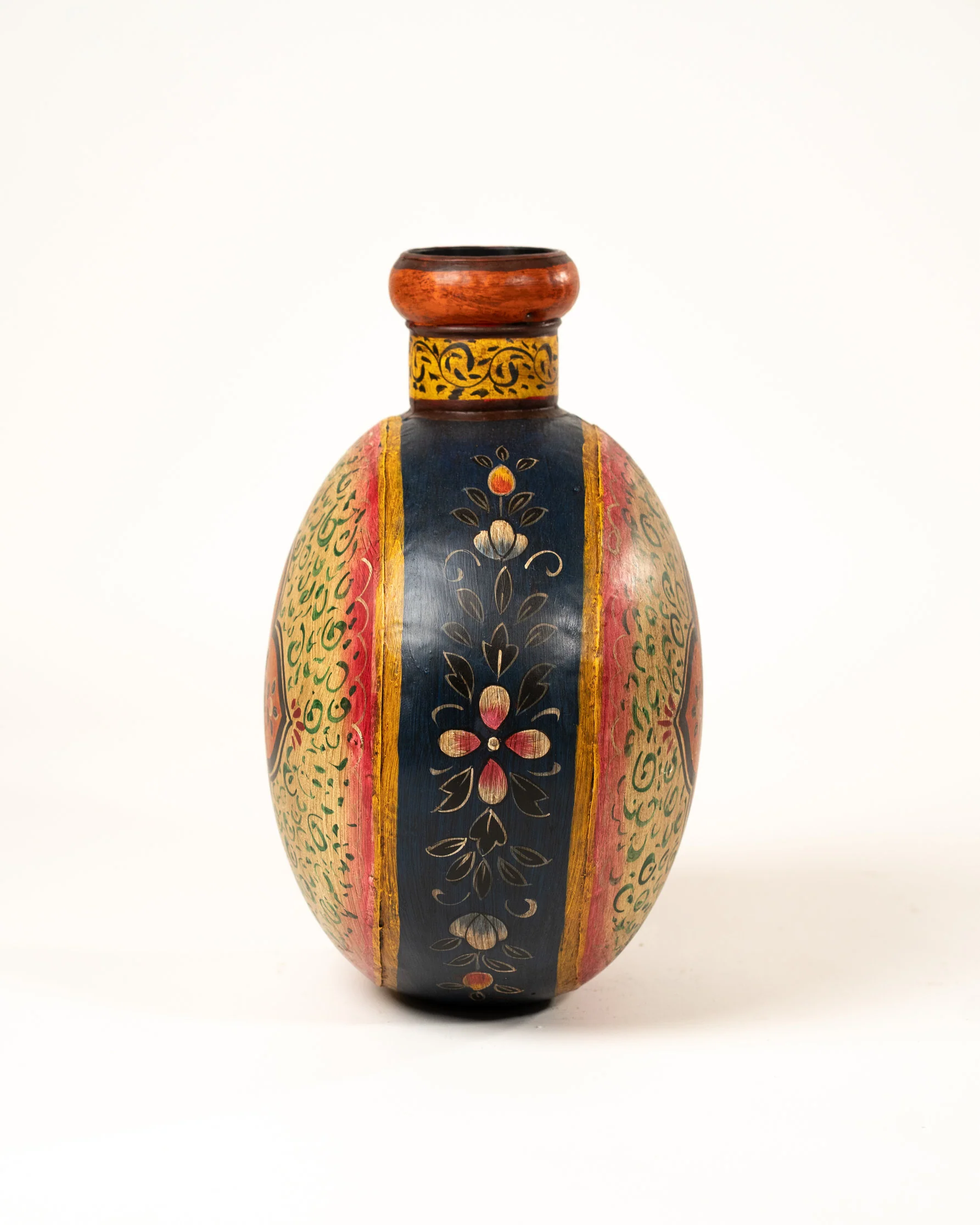 Sa forme plate et ronde, associée à un col orange, en fait une pièce à la fois originale et raffinée. Le fond jaune pâle contraste avec les décorations bleu, rouge, orange et vert sublimées par des détails végétaux peints avec précision. Chaque pot est une œuvre unique, témoignant du savoir-faire et de la richesse artistique de l’artisanat indien.