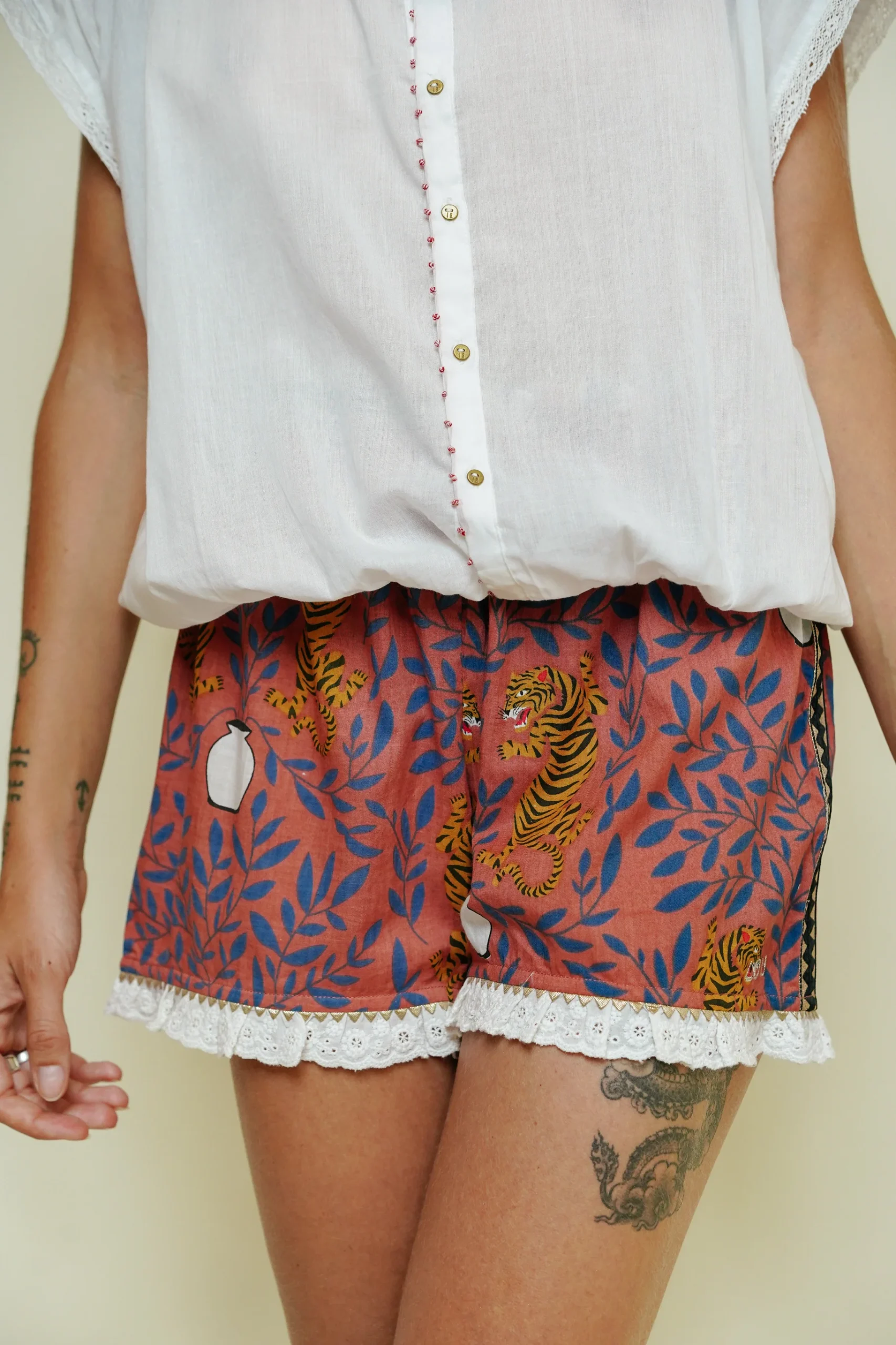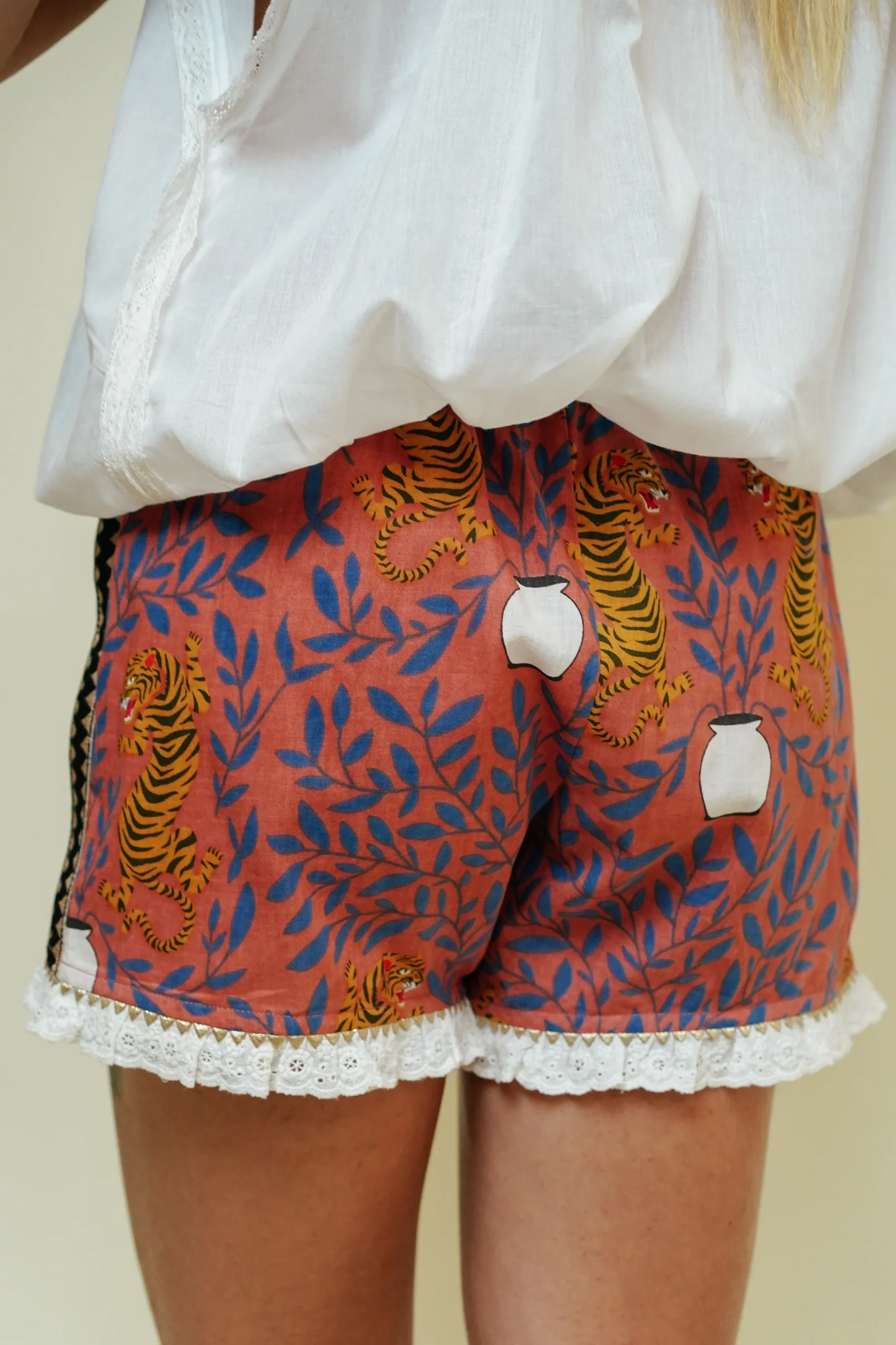 Craquez pour nos adorables shorts conçus dans les mêmes tissus que nos iconiques boubous. Ici, le short boubou Lou est confectionné dans le tissu du boubou Rajah. Une fine ceinture à volants dans un tissu tartan, un galon pailleté sur le côté des jambes et une délicate dentelle anglaise sur la fin de la jambe.