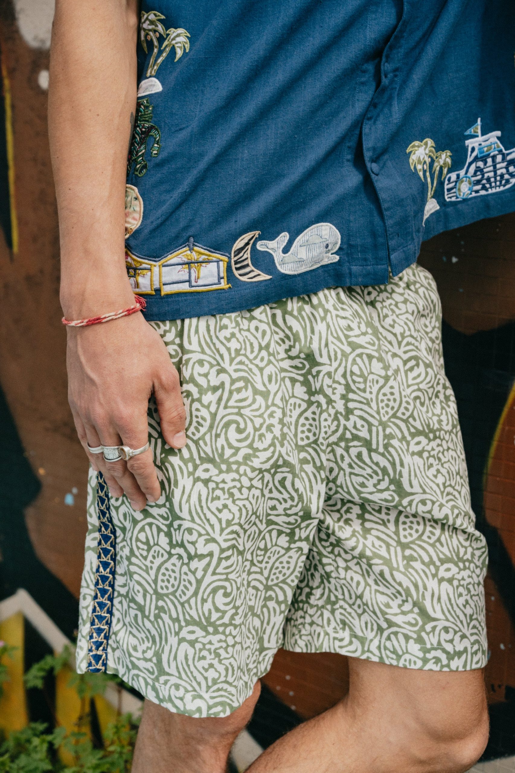 Le short L’Île Bleue s’arrête au début du genoux, a une ceinture élastique, des poches ouvertures à l’italienne et une bande brodée sur le côté de la jambe.