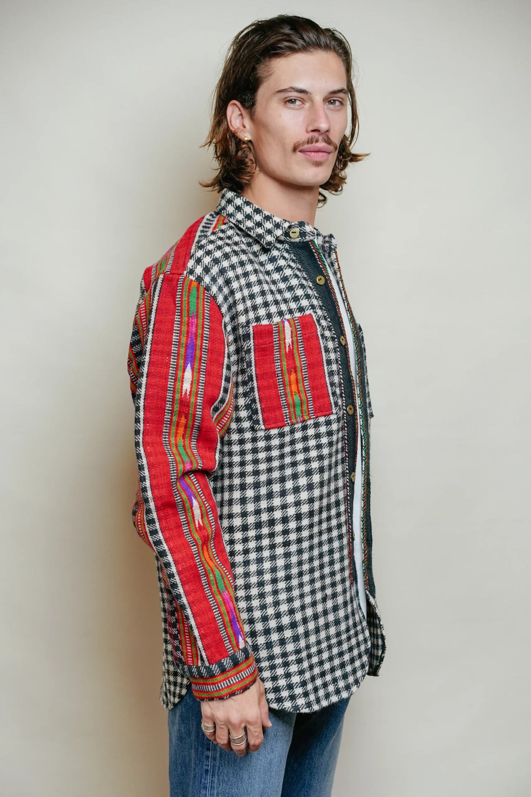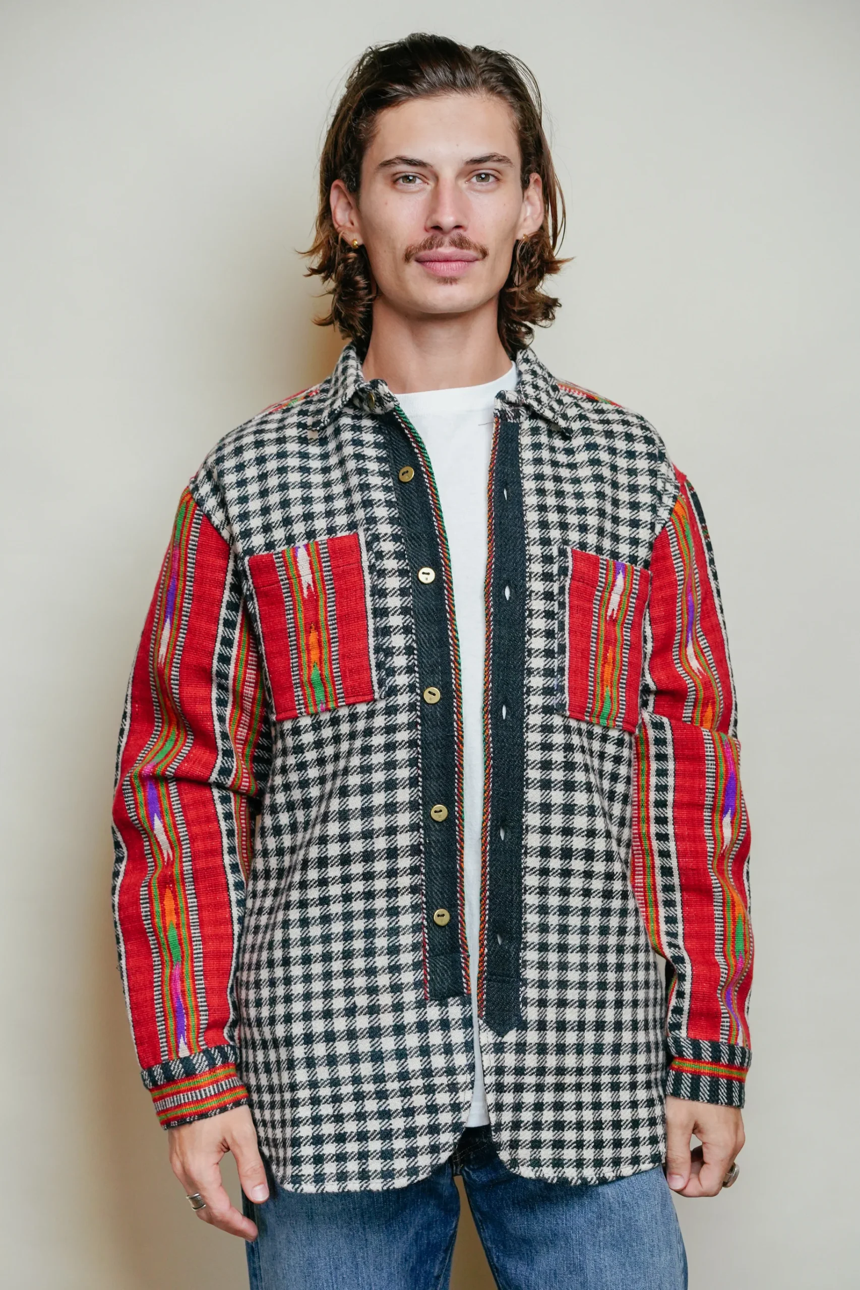 Apportez une touche unique à votre vestiaire avec cette surchemise en laine, fruit d’un travail artisanal alliant authenticité et modernité. Imaginé à Bordeaux et réalisée en Inde, elle se distingue par son mélange de motifs : un élégant carreau noir et blanc sublimé par des empiècements colorés tissés à la main.