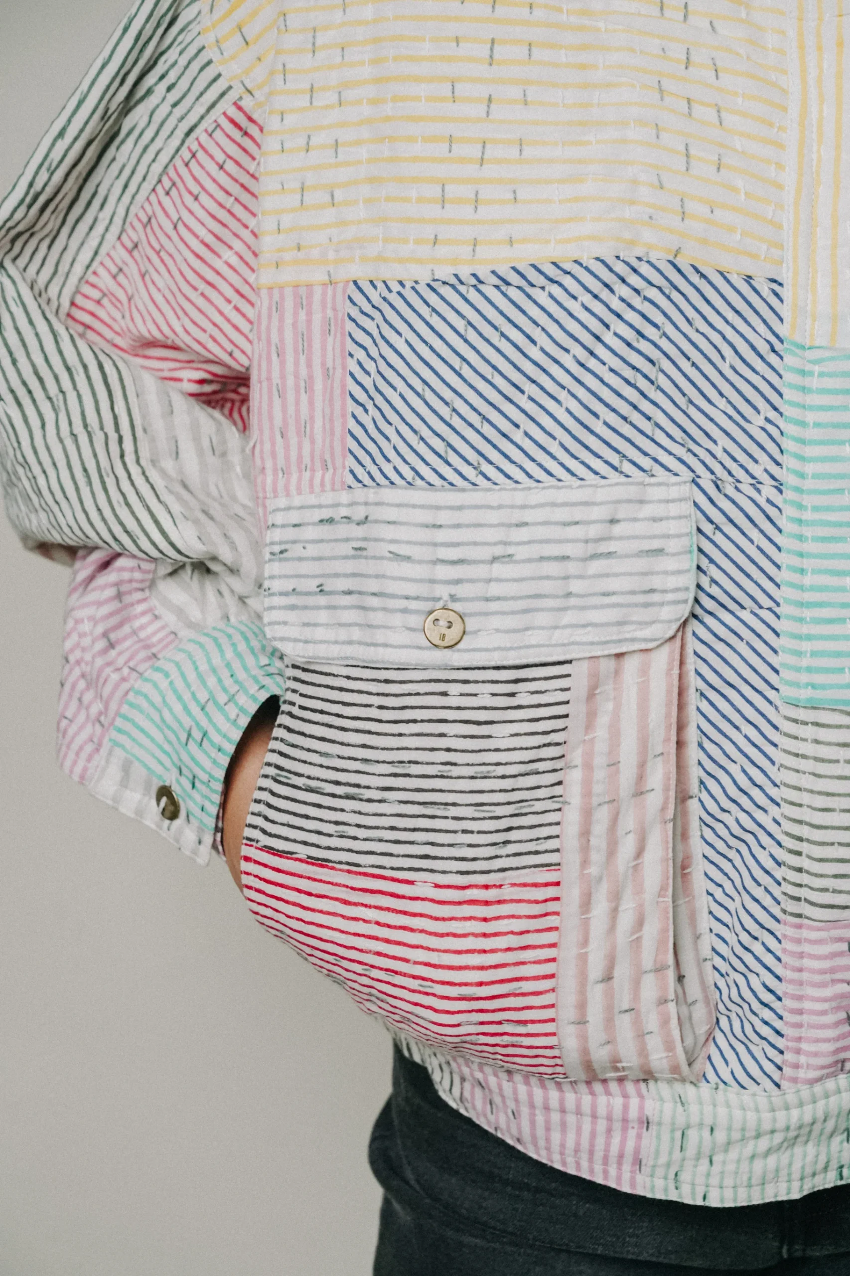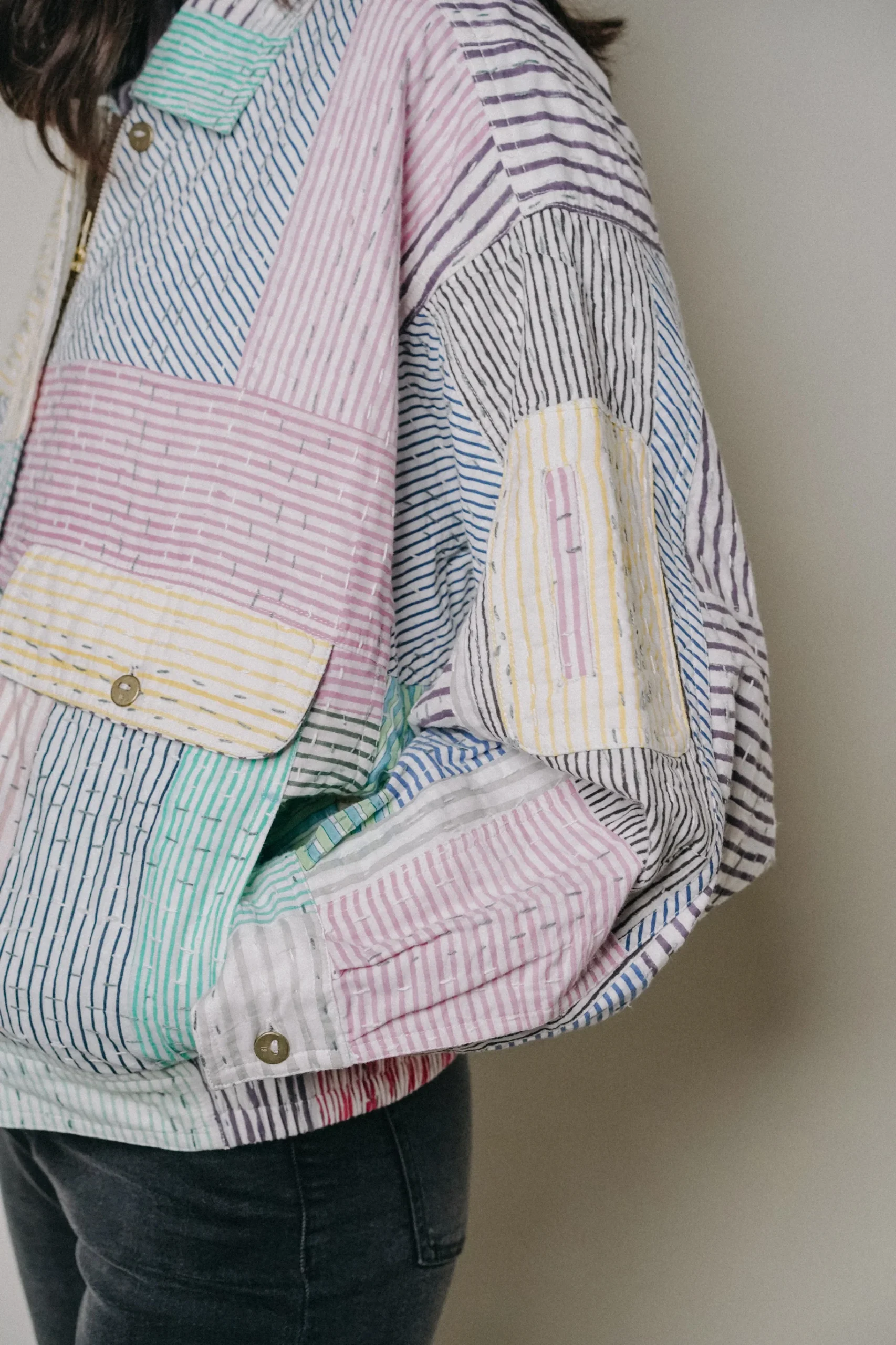 La veste est en 100% coton avec deux poches latérales, une poche cachée sur la manche gauche, une fermeture à zip et une languette avec bouton pour fermer le bas de la veste.