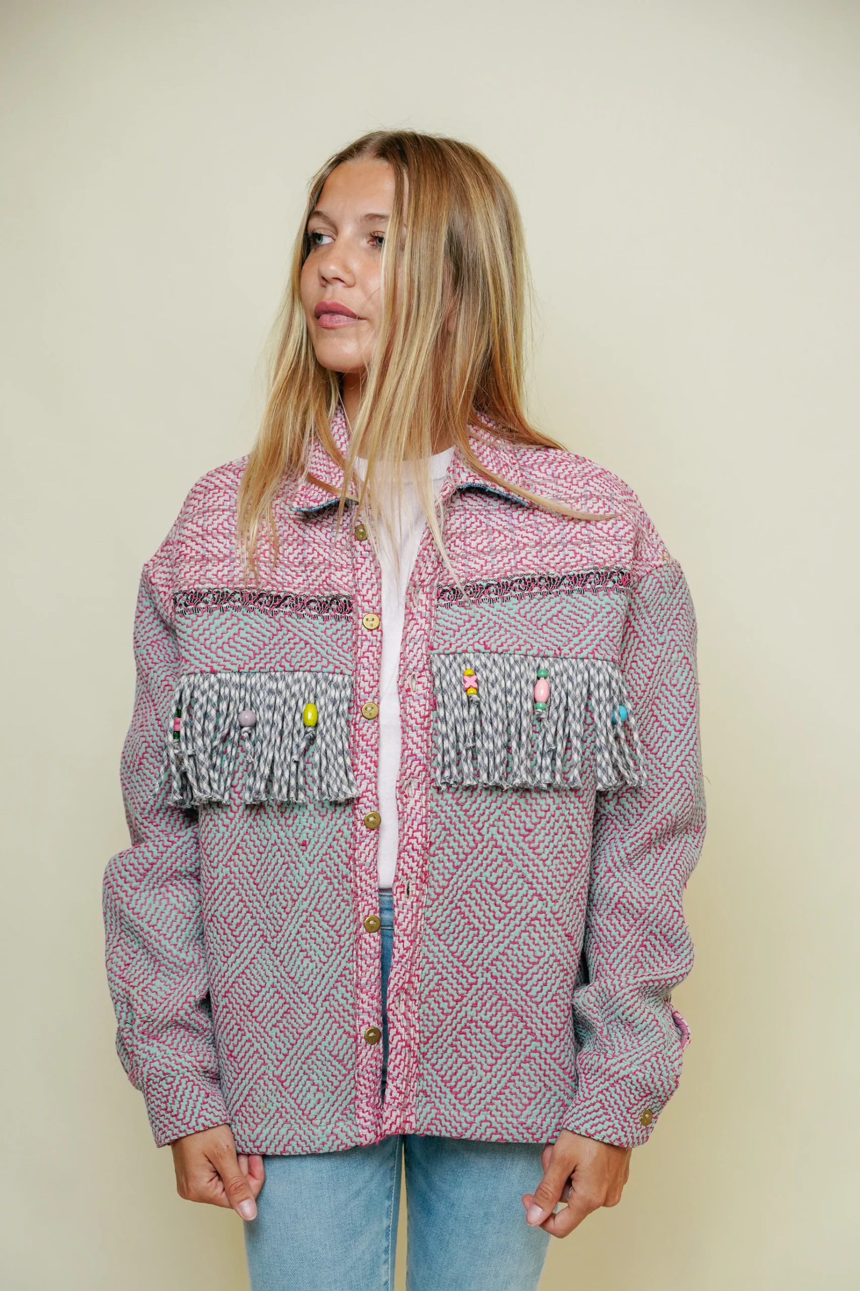 Polyvalente et légère, cette veste se superpose facilement sur une robe d’été, un t-shirt ou même un maillot de bain. Il apporte instantanément une touche bohème-chic et artisanale à n’importe quelle silhouette.