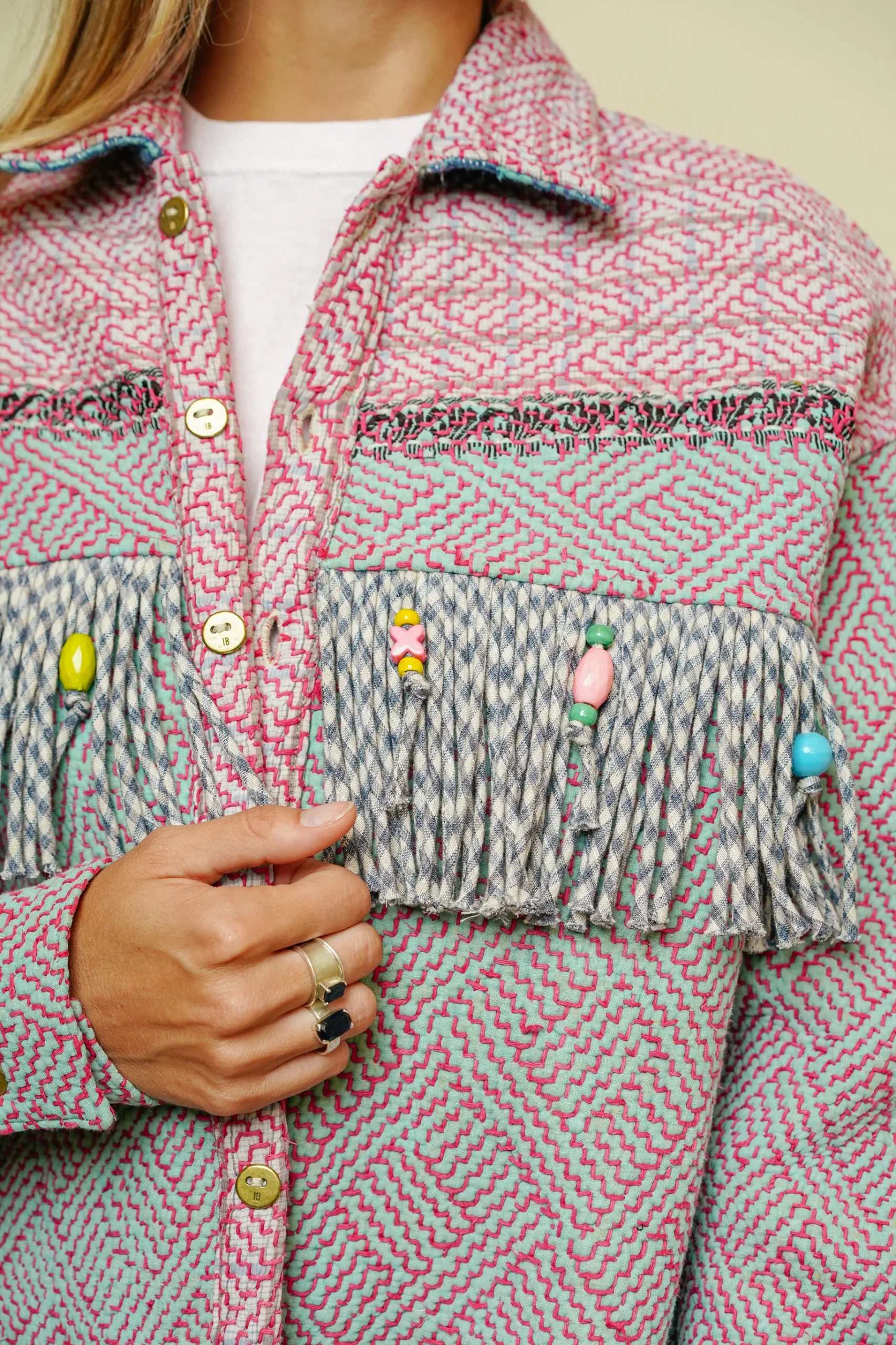La grande nouveauté de cette saison ? Les franges en kantha habillées de perles, cousues en frise tout le long du dos et à l’avant au niveau de la poitrine. Un détail original et raffiné qui attire la lumière et donne du relief à la pièce. Le gilet est entièrement réversible : l’envers, plus sobre, sans franges, permet un porté plus épuré selon vos envies.