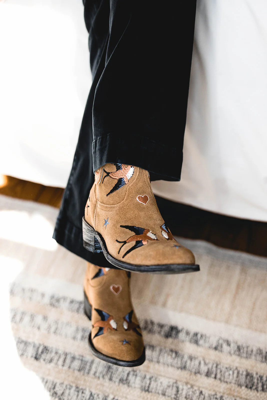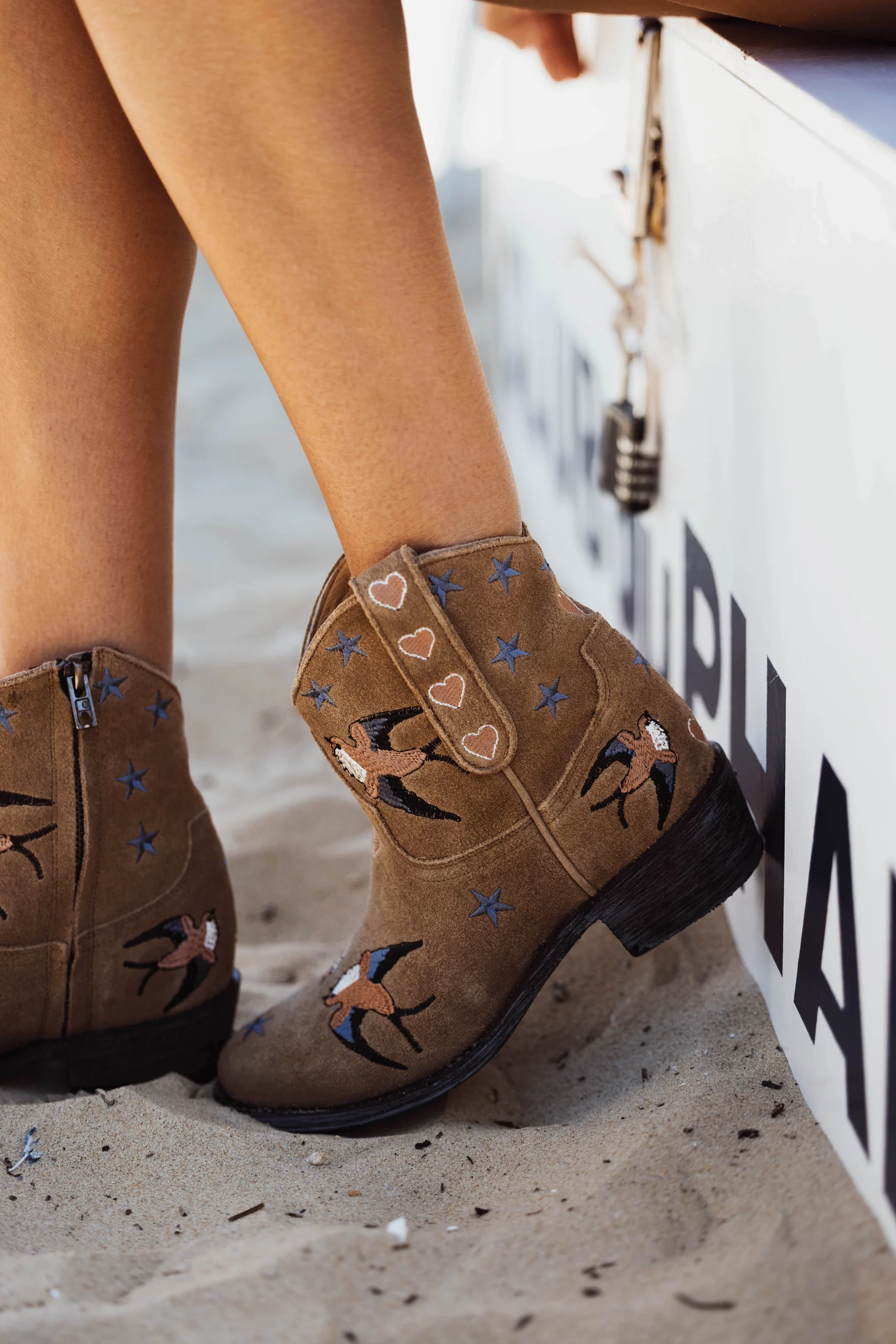 Les toutes dernières boots Golondrina 7 marrons. BOTTINES À BOUT ROND AVEC BRODERIE HIRONDELLE ET FERMETURE LATÉRALE ZIPPÉE. Hauteur 14 cm Hauteur totale du talon 4.5 cm 100% cuir de vachette Couleur beige Semelle en cuir Talon en cuir Languette latérale Fabriqué à la main au Mexique
