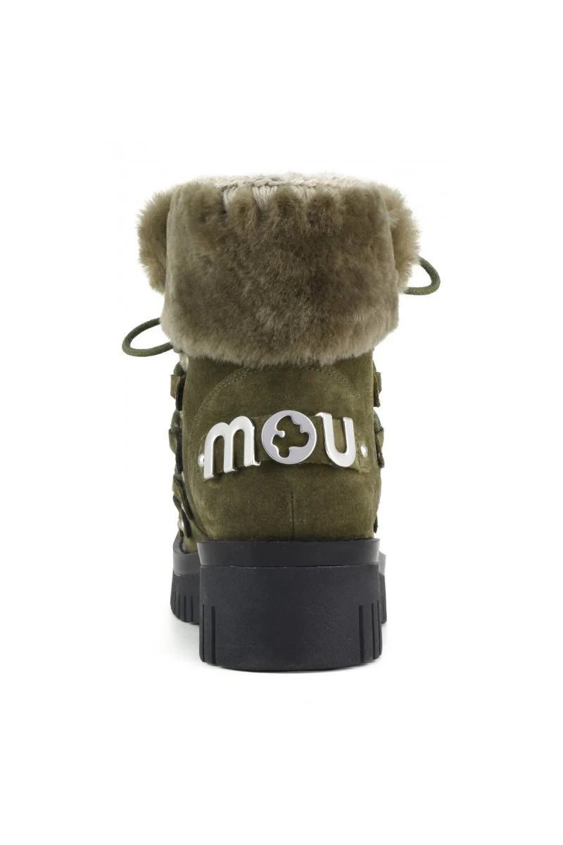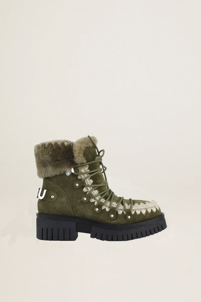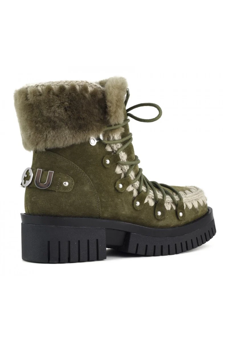 Les bottes de combat Mou eskimo à lacets sont fabriquées à la main dans un daim vert luxueux, avec le logo mou métallique à l’arrière et les coutures au crochet emblématiques.