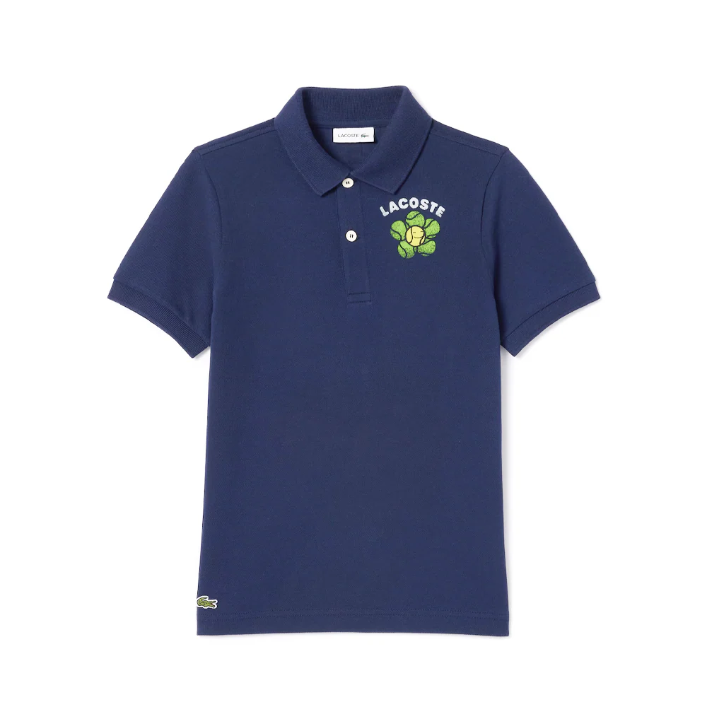 Lacoste, inventeur du polo en 1933, présente cette version réservée aux enfants. Confectionné dans leur tissu signature en mini piqué fin, il arbore un imprimé vintage audacieux représentant une fleur et une balle de tennis. Détails rétro, style moderne.
