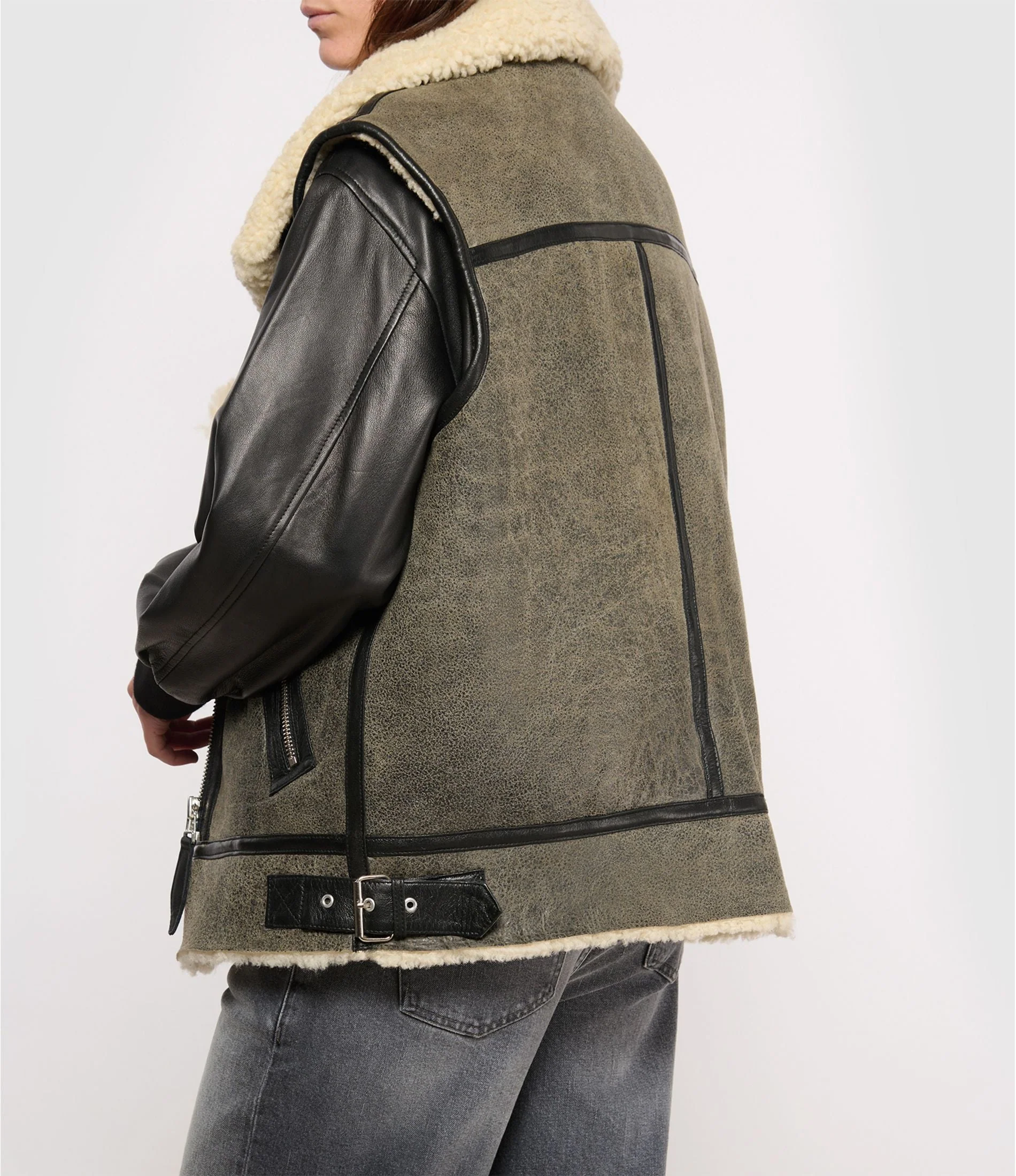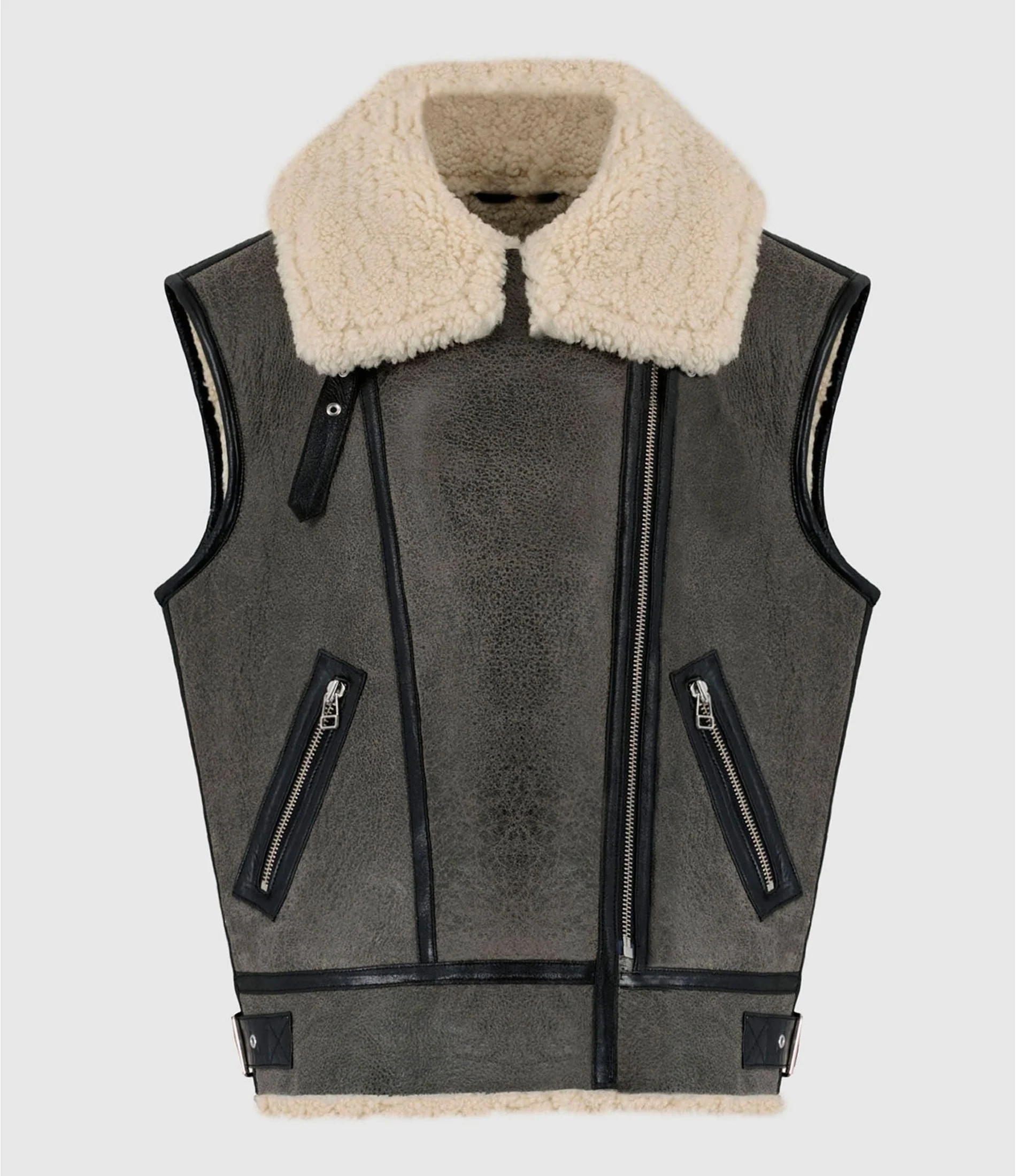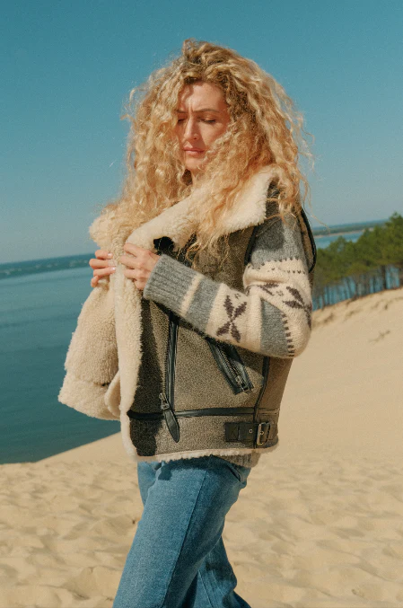 Le Christelle Gilet Used incarne à la perfection l’alliance de la sophistication et du confort. Réalisé en peau lainée de haute qualité, ce gilet sans manches se distingue par sa teinte tabac naturelle, offrant un look authentique et intemporel. Sa coupe oversize dessine une silhouette moderne et décontractée, idéale à superposer sur un pull ou une chemise.