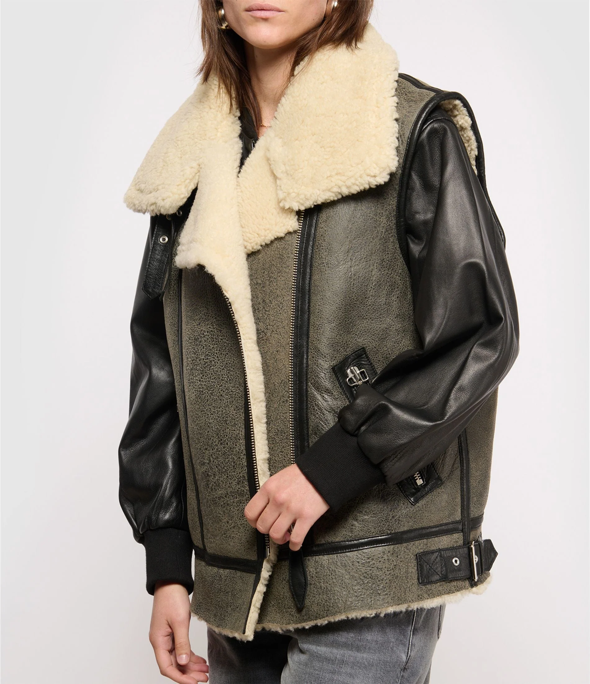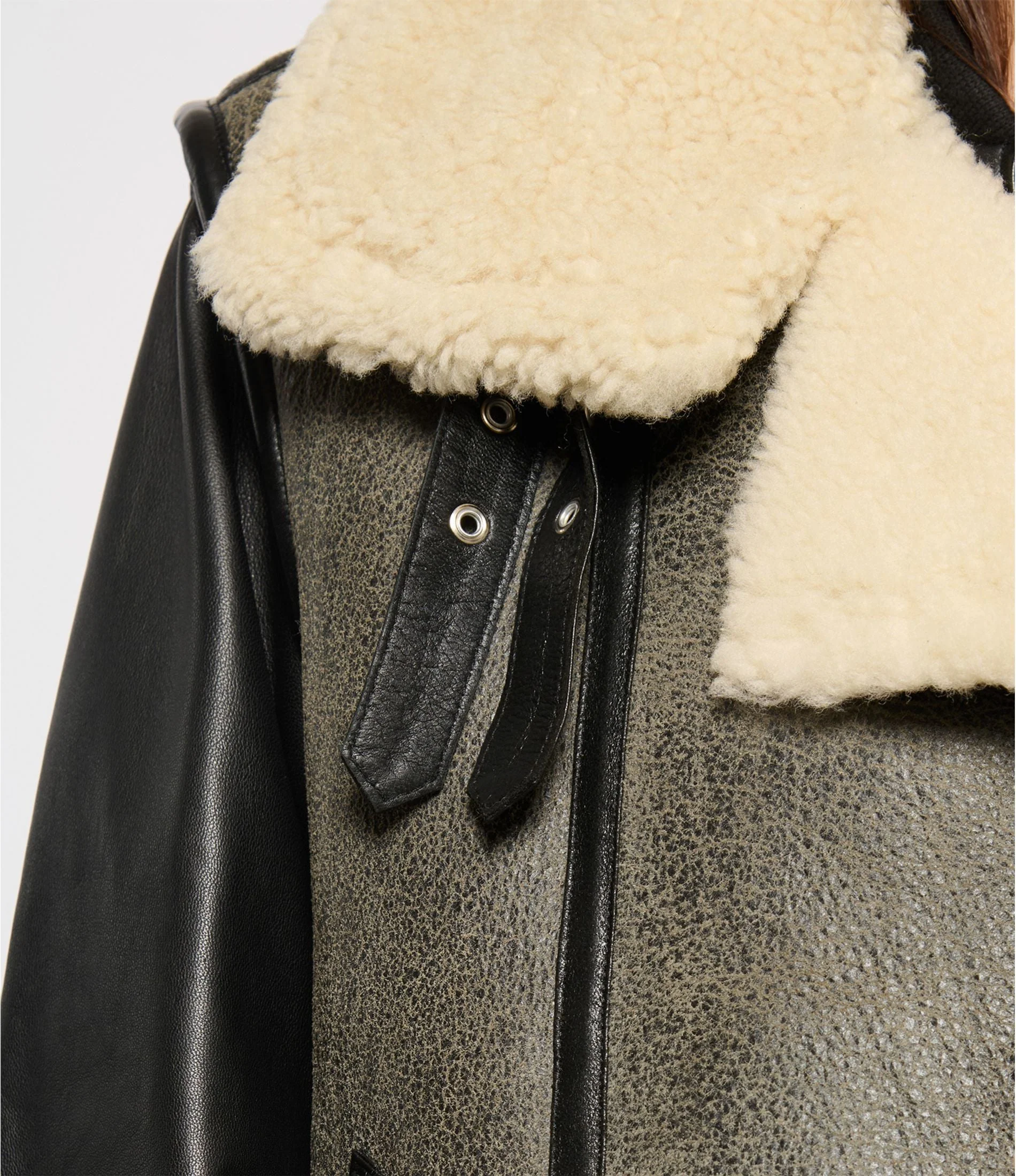 Le col large en shearling, amovible, apporte une touche d’élégance et de chaleur supplémentaire, permettant de multiples options de style selon vos envies. Les détails en cuir lisse sur les fermetures éclair ainsi que les sangles ajustables accentuent le caractère luxueux de cette création signée Serge Pariente.